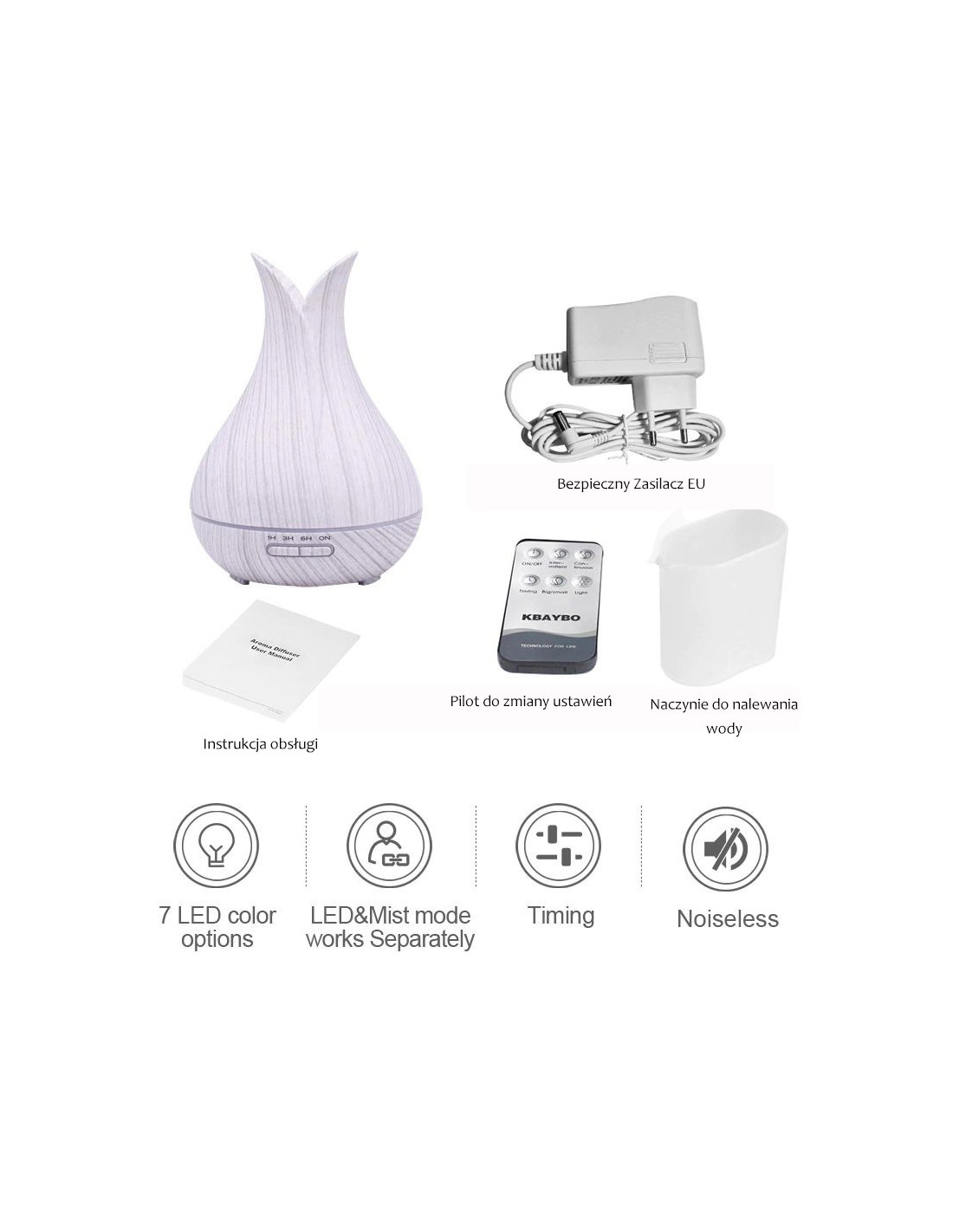 - Dzięki zastosowaniu technologii ultradźwiękowej nawilżacz jest wyjątkowo cichy podczas pracy, doskonale nadaje się do używania podczas snu.