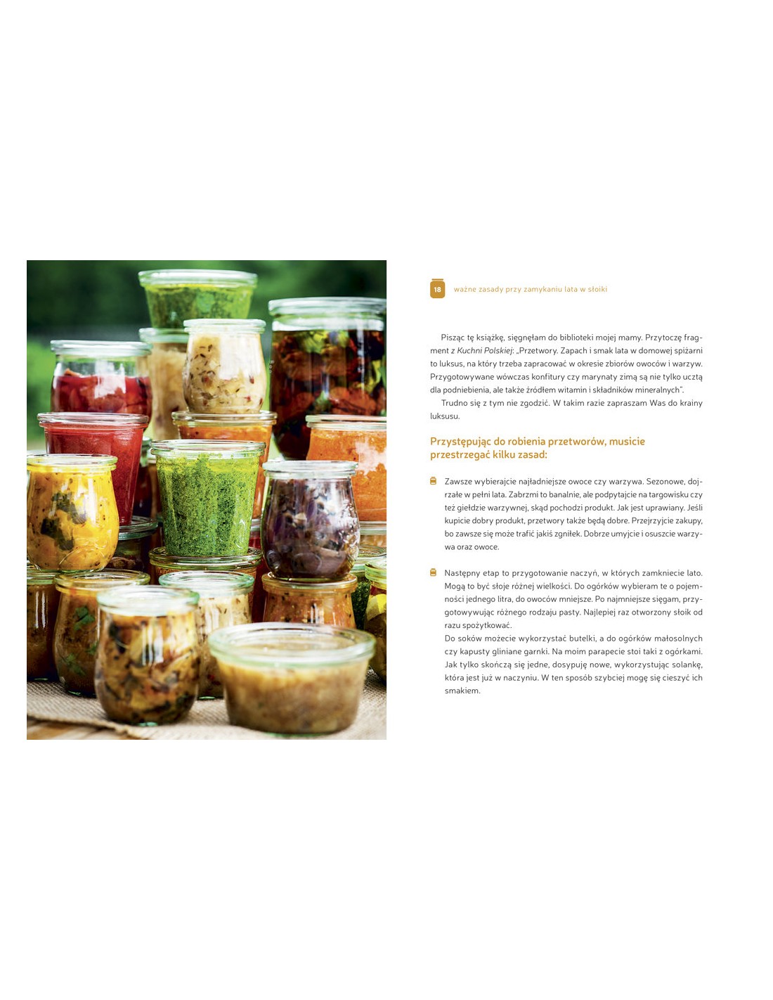"Zapraszam Was w sentymentalną podróż do czasów mojego dzieciństwa: do lata na wsi, które przebiegało w rytm pojawiających się owoców i warzyw, czekających tylko na zawekowanie; do słoików, które dumnie czekały na swoją kolej w zimowej spiżarni; do przepisów, które do tej pory były pilnie strzeżoną rodzinną tajemnicą. Zabiorę Was też w wyprawę po smakach, które odkrywałam podczas podróży i zdradzę moje ulubione przepisy z całego świata, m.in. na ajvar, pesto czy chutney. Mam nadzieję, że książka, którą właśnie trzymacie, będzie dla Was ogromną inspiracją i sprawi, że powrócicie do tej wspaniałej tradycji, jaką jest przygotowywanie własnych przetworów".