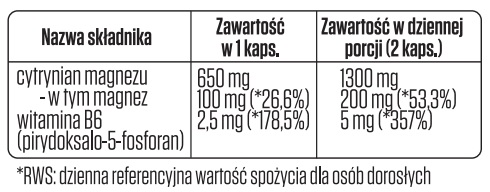 Składniki: magnez (cytrynian magnezu), witamina B6 (pirydoksalo-5-fosforan), składnik kapsułki (żelatyna – składnik otoczki)