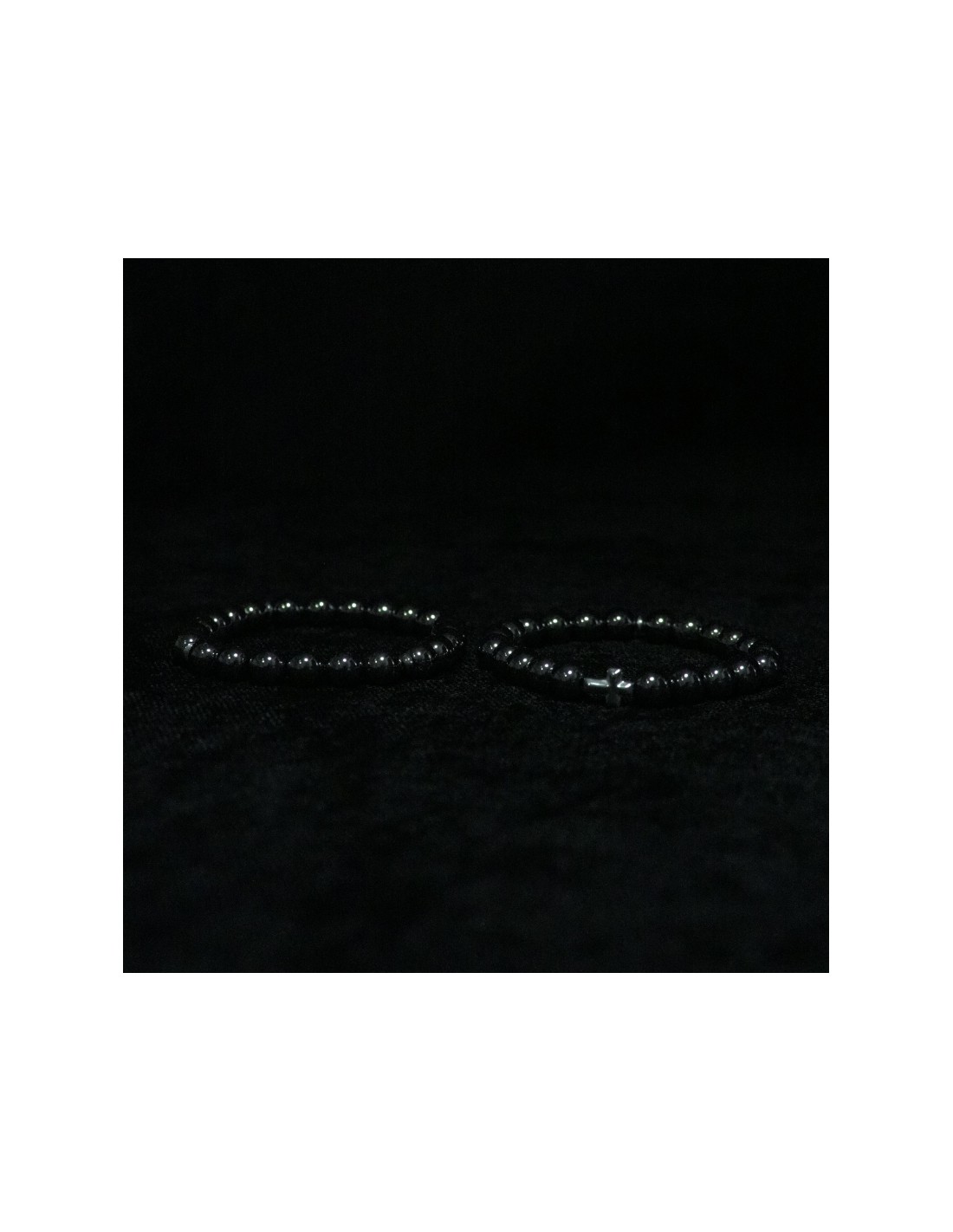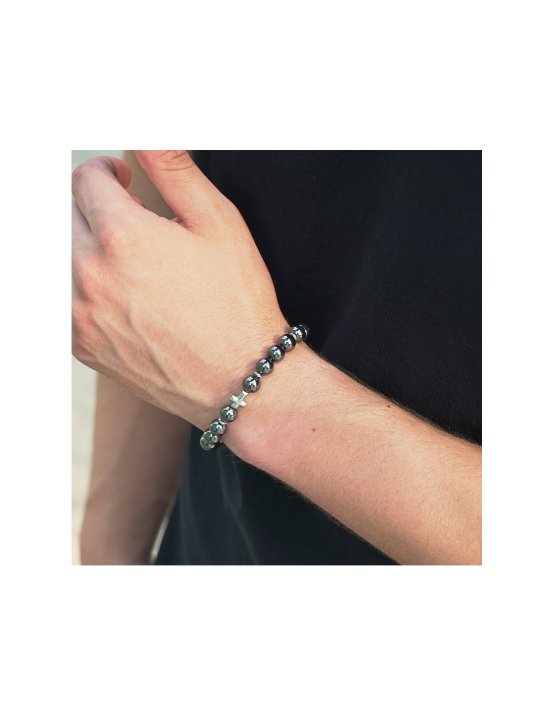 Użyto: kamień naturalny, przekładki (krzyż) z hematytu, żyłka jubilerska.