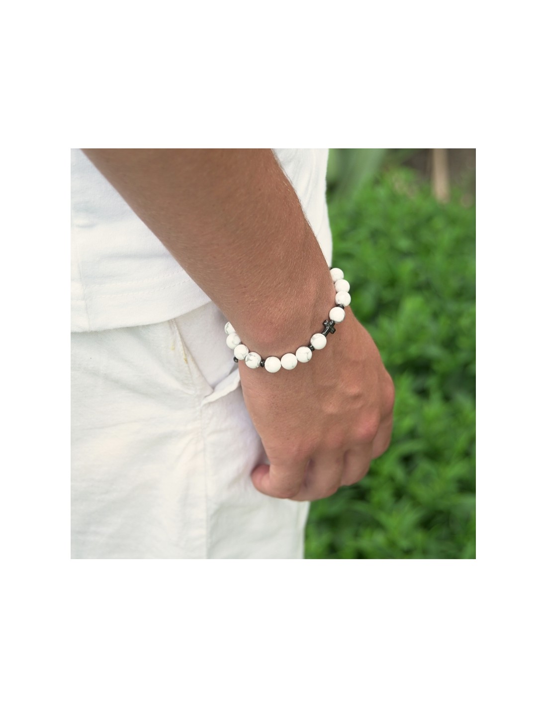 Użyto: kamień naturalny, przekładki (krzyż) z hematytu, żyłka jubilerska.