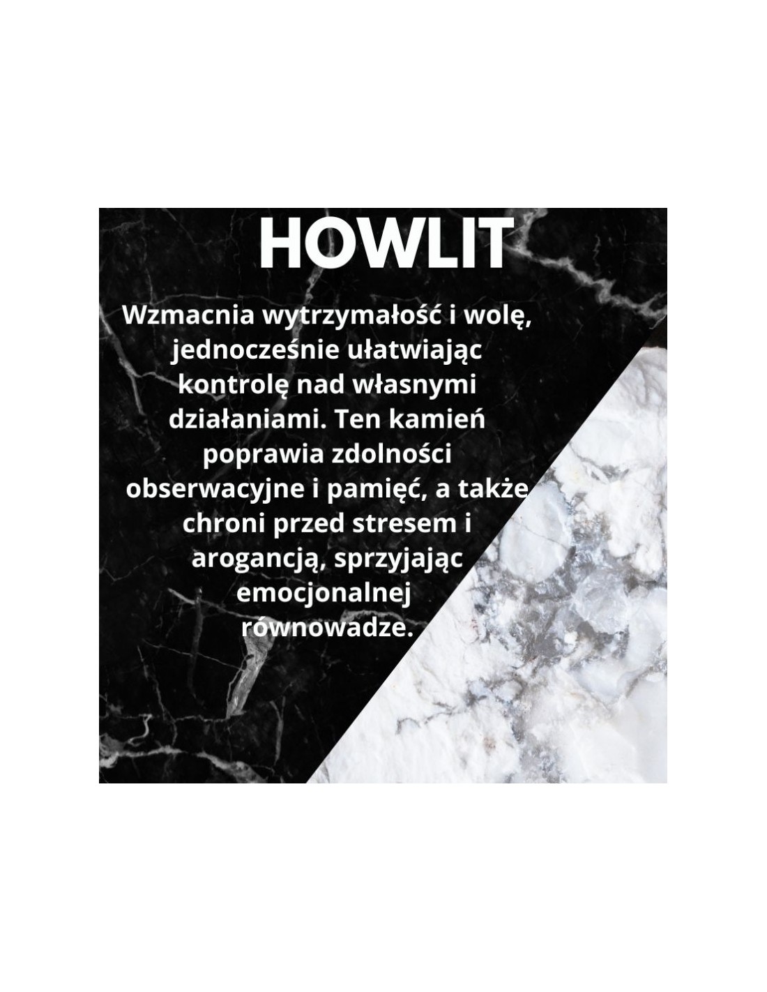 Howlit wzmacnia wytrzymałość i wolę, jednocześnie ułatwiając kontrolę nad własnymi działaniami. Ten kamień poprawia zdolności obserwacyjne i pamięć, a także chroni przed stresem i arogancją, sprzyjając emocjonalnej równowadze.