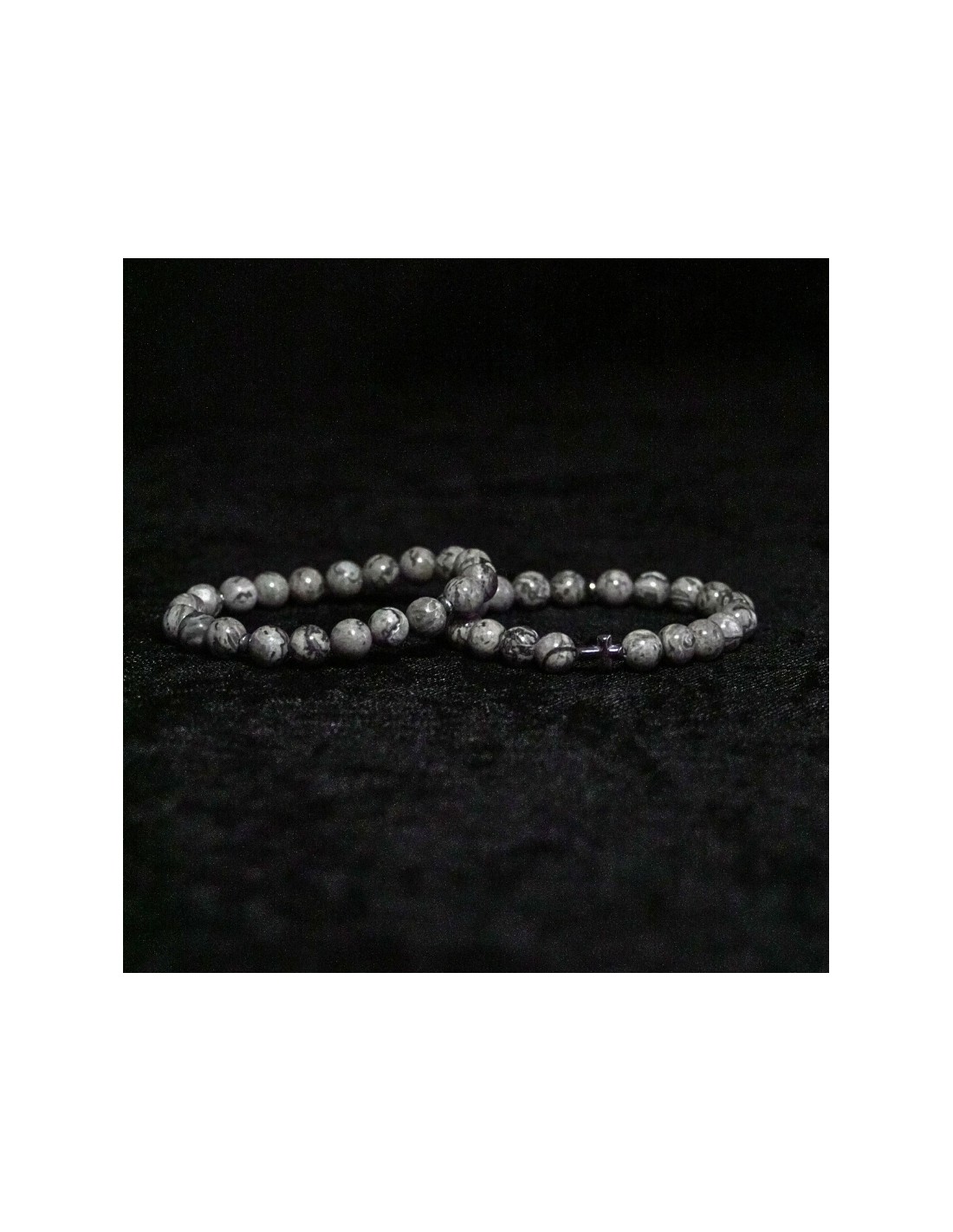 Użyto: kamień naturalny, przekładki (krzyż) z hematytu, żyłka jubilerska.