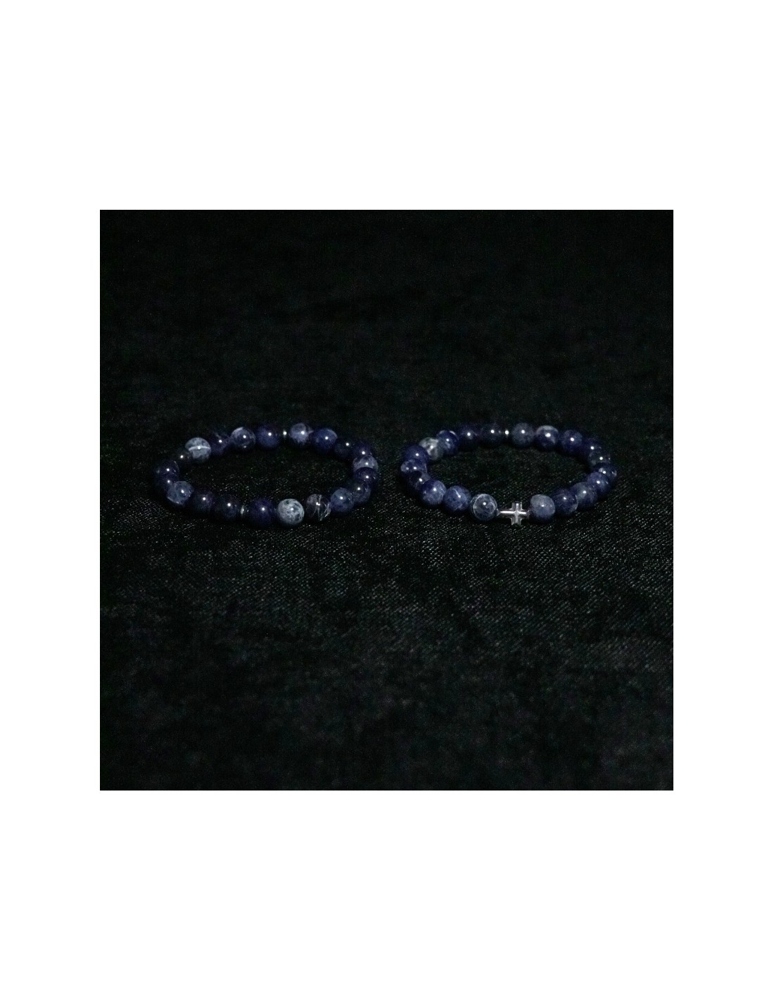 Użyto: kamień naturalny, przekładki (krzyż) z hematytu, żyłka jubilerska.