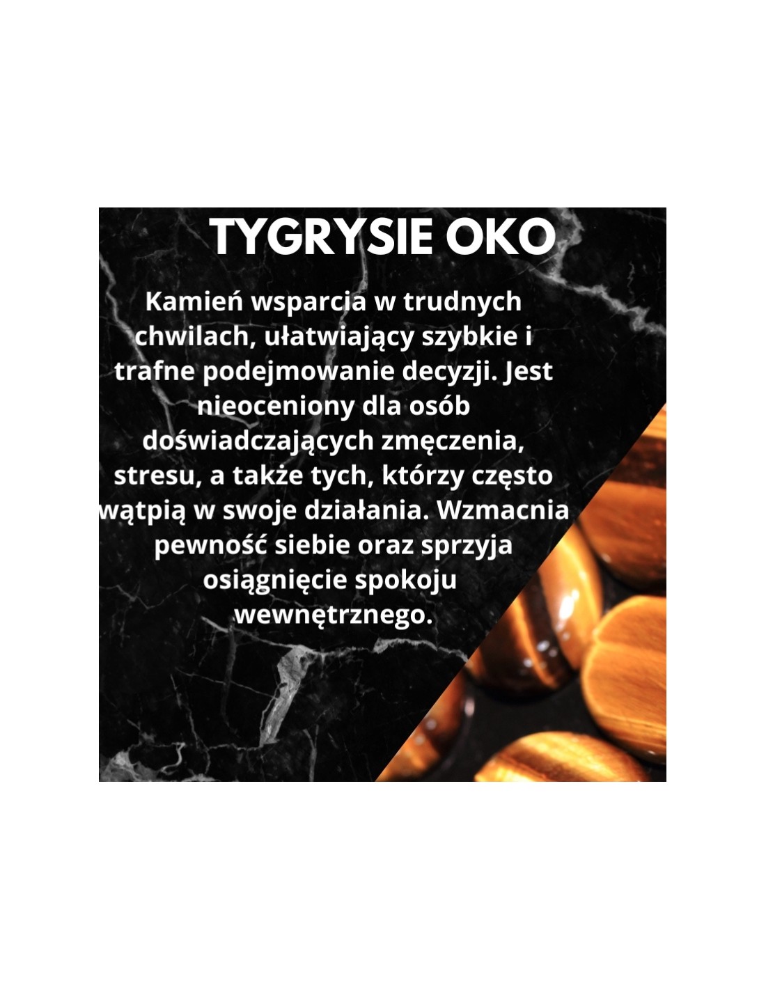 Tygrysie Oko to kamień wsparcia w trudnych chwilach, ułatwiający szybkie i trafne podejmowanie decyzji. Jest nieoceniony dla osób doświadczających zmęczenia, stresu, a także tych, którzy często wątpią w swoje działania. Stabilizujące właściwości tego kamienia wzmacniają pewność siebie, sprzyjając osiągnięciu spokoju wewnętrznego i lepszemu zarządzaniu codziennymi wyzwaniami.