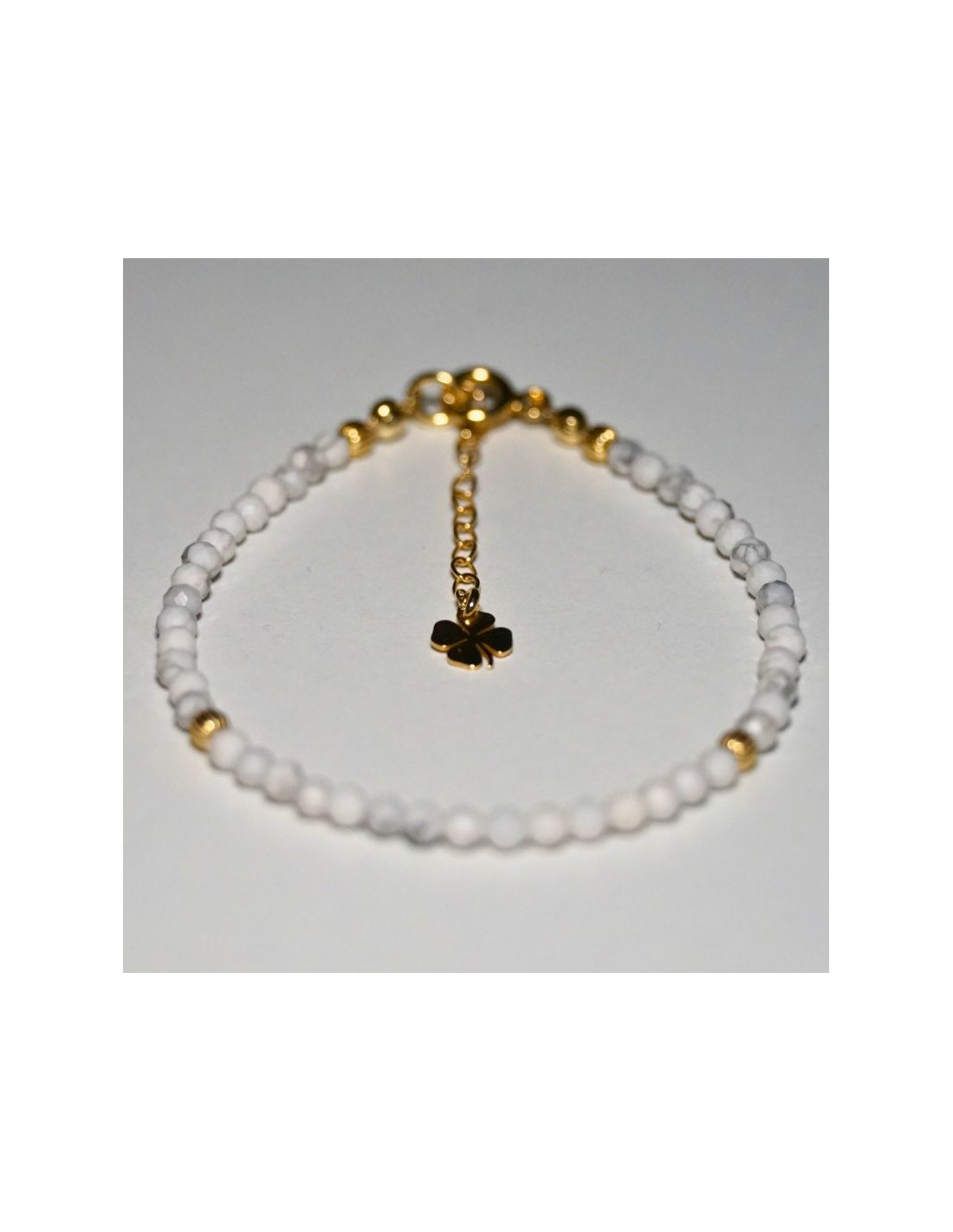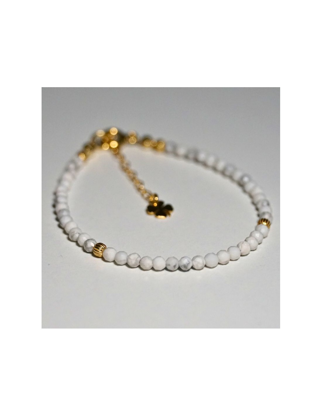 Użyto: Kamień Howlit, przekładki, zapięcie oraz przedłużka pozłacane srebro próby 925, zawieszka w formie koniczynki wykonana z pozłacanego srebra.