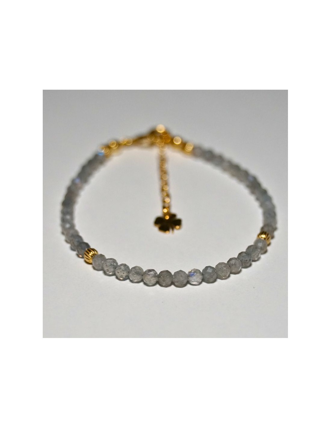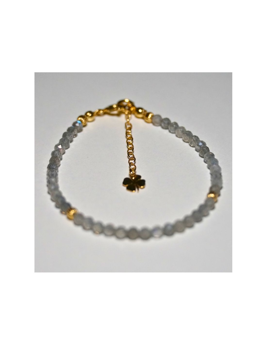 Użyto: Kamień półszlachetny Labradoryt, przekładki, zapięcie oraz przedłużka pozłacane srebro próby 925, zawieszka w formie koniczynki wykonana z pozłacanego srebra.