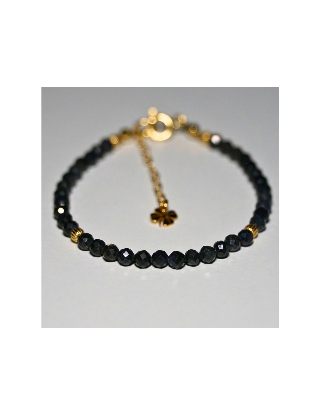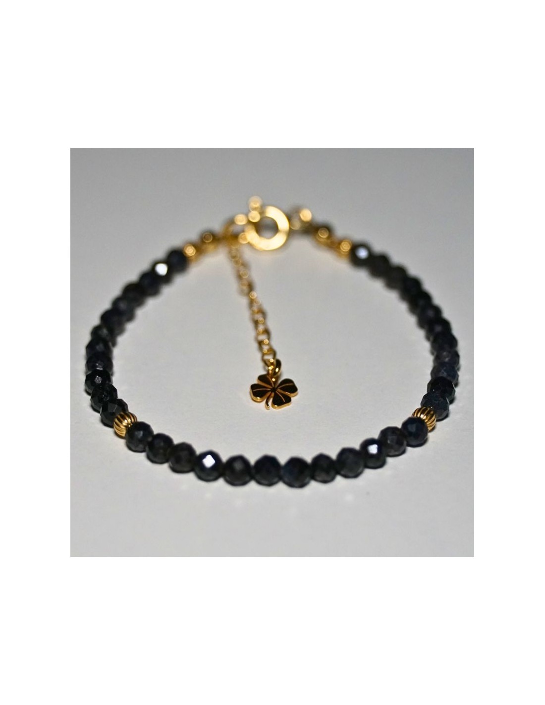 Użyto: Kamień szlachetny Szafir ciemny, przekładki, zapięcie oraz przedłużka pozłacane srebro próby 925, zawieszka w formie koniczynki wykonana z pozłacanego srebra.