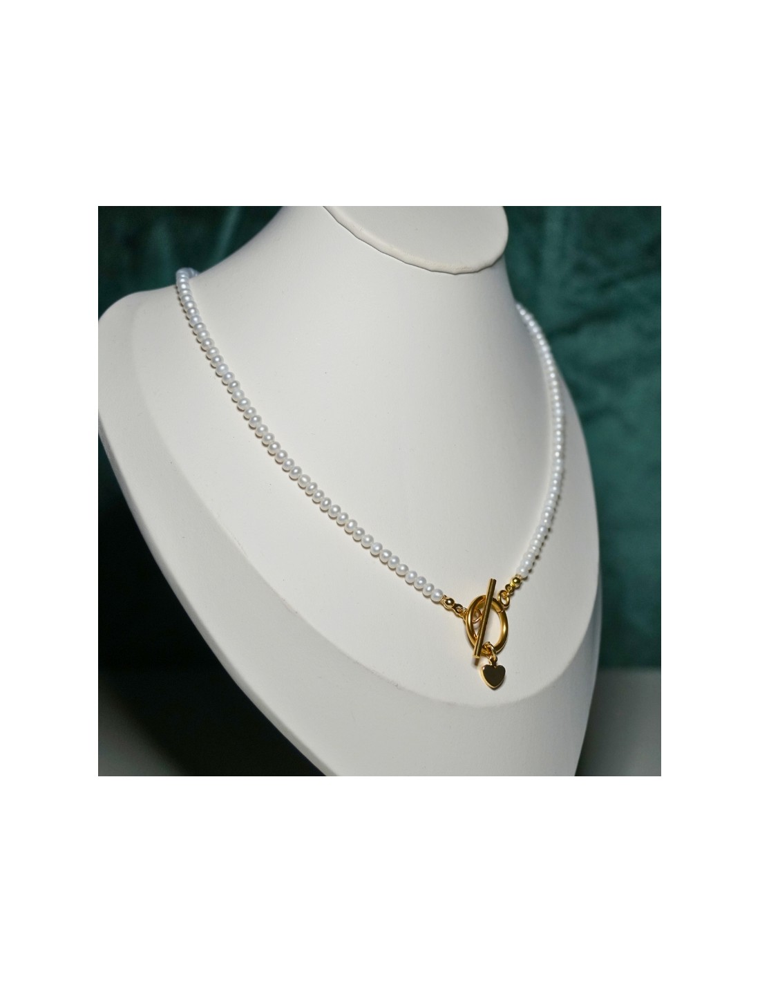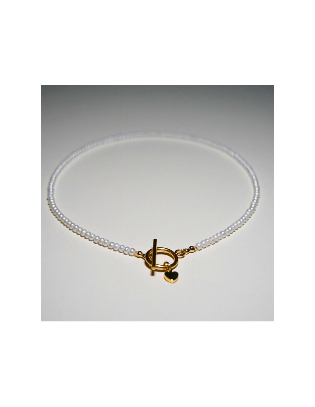 Użyto: Perły hodowlane (naturalne), zakończenia pozłacane srebro próba 925, zapięcie toggle oraz serduszko wykonane ze stali szlachetnej.