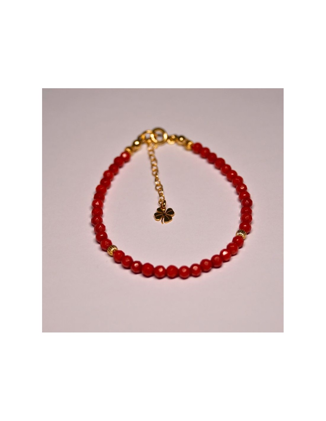 Użyto: Koral czerwony, przekładki, zapięcie oraz przedłużka pozłacane srebro próby 925, zawieszka w formie koniczynki wykonana z pozłacanego srebra.