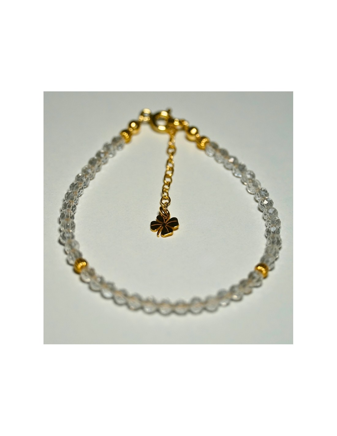 Użyto: Kamień Kryształ Górski, przekładki, zapięcie oraz przedłużka pozłacane srebro próby 925, zawieszka w formie koniczynki wykonana z pozłacanego srebra.
