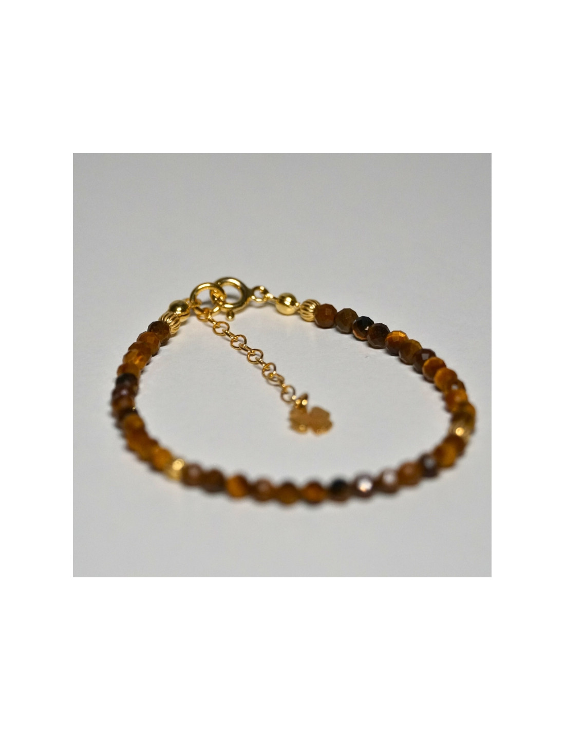 Użyto: Kamień Tygrysie oko, przekładki, zapięcie oraz przedłużka pozłacane srebro próby 925, zawieszka w formie koniczynki wykonana z pozłacanego srebra.