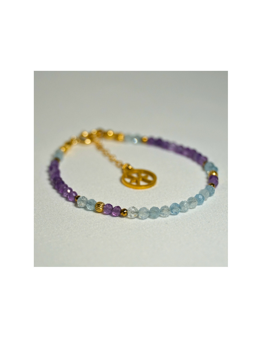 Użyto: Akwamaryn oraz Ametyst, przekładki, zapięcie oraz przedłużka pozłacane srebro próby 925, zawieszka w formie znaku zodiaku wykonana ze stali chirurgicznej.