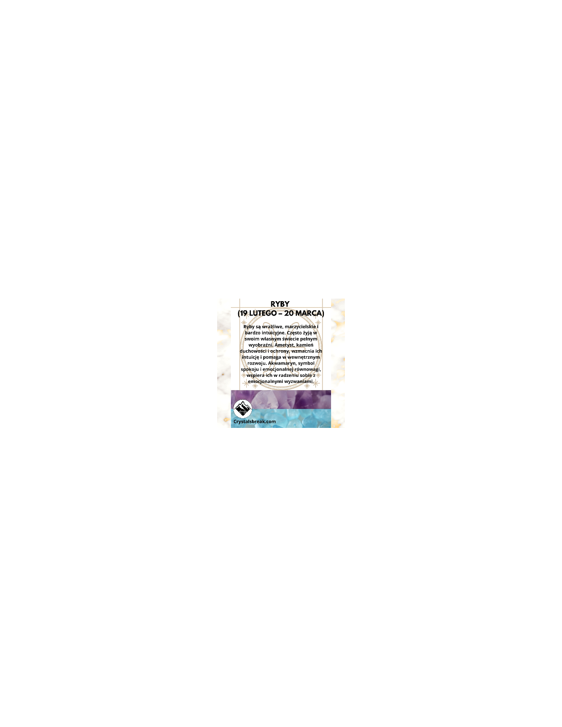 Ryby są wrażliwe, marzycielskie i bardzo intuicyjne. Często żyją w swoim własnym świecie pełnym wyobraźni. Ametyst, kamień duchowości i ochrony, wzmacnia ich intuicję i pomaga w wewnętrznym rozwoju. Akwamaryn, symbol spokoju i emocjonalnej równowagi, wspiera ich w radzeniu sobie z emocjonalnymi wyzwaniami.