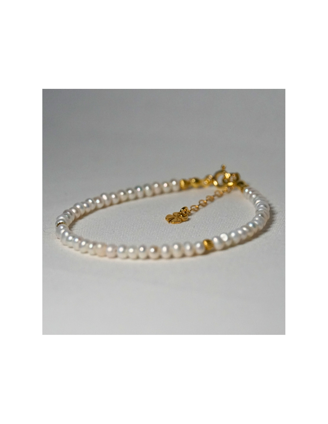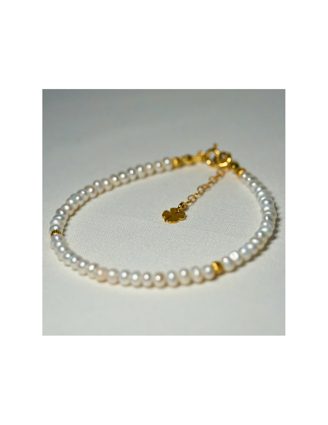 Użyto: Perły naturalne, przekładki, zapięcie oraz przedłużka pozłacane srebro próby 925, zawieszka w formie koniczynki wykonana z pozłacanego srebra.