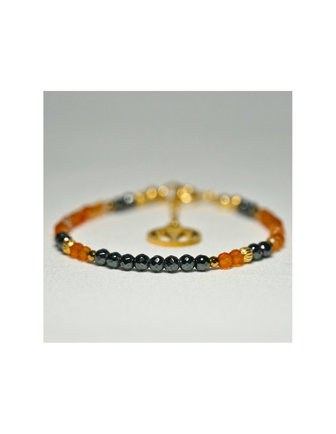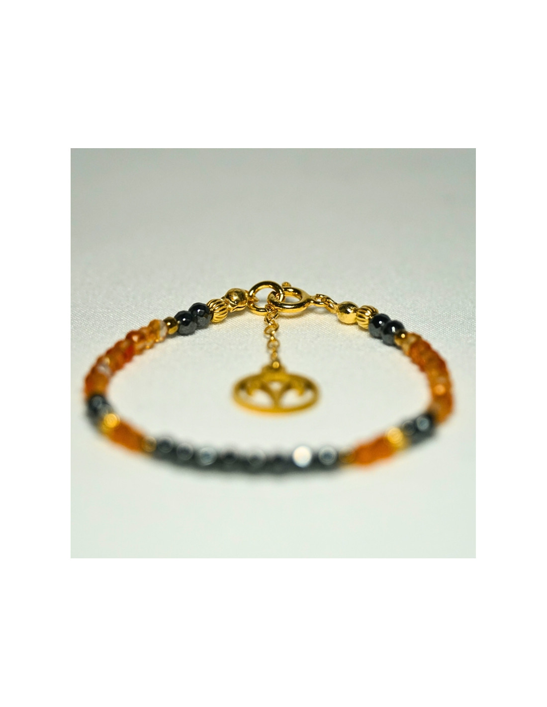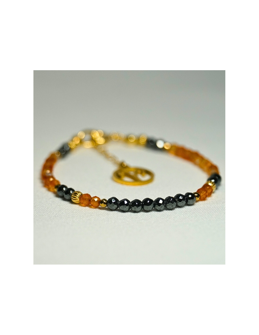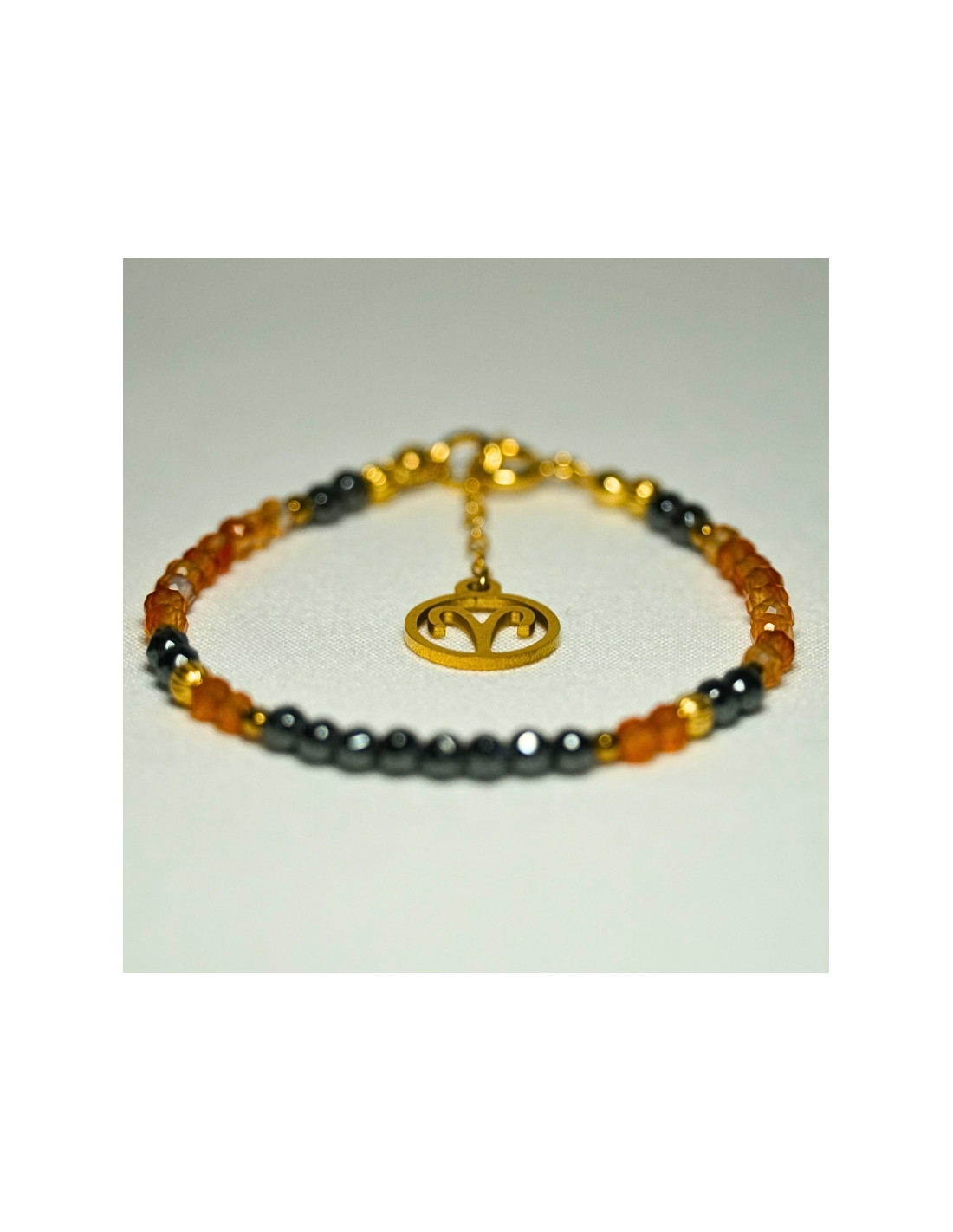 Użyto: Karneol oraz Hematyt, przekładki, zapięcie oraz przedłużka pozłacane srebro próby 925, zawieszka w formie znaku zodiaku wykonana ze stali chirurgicznej.