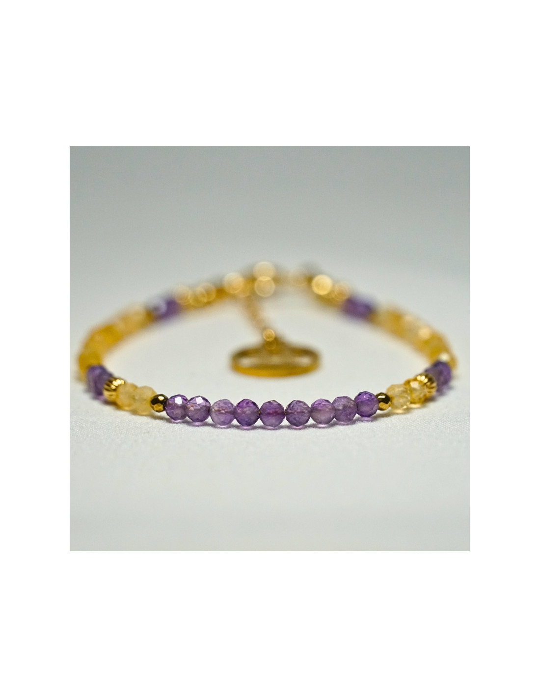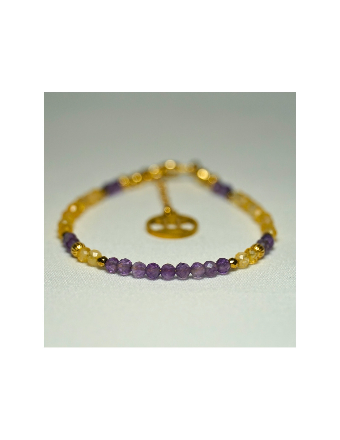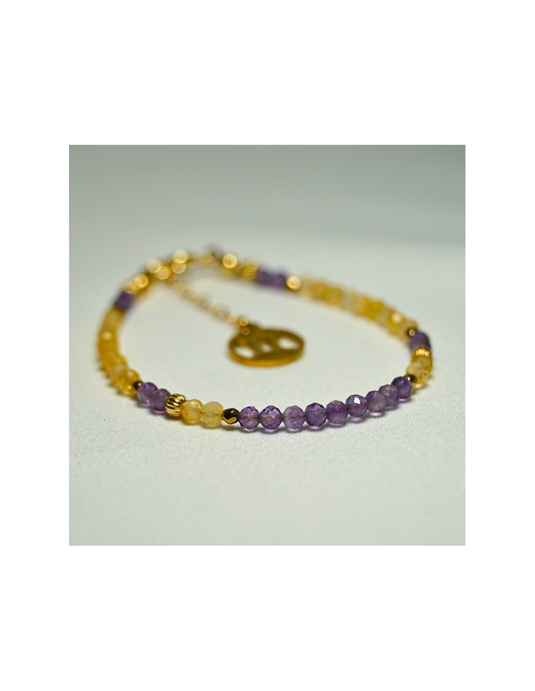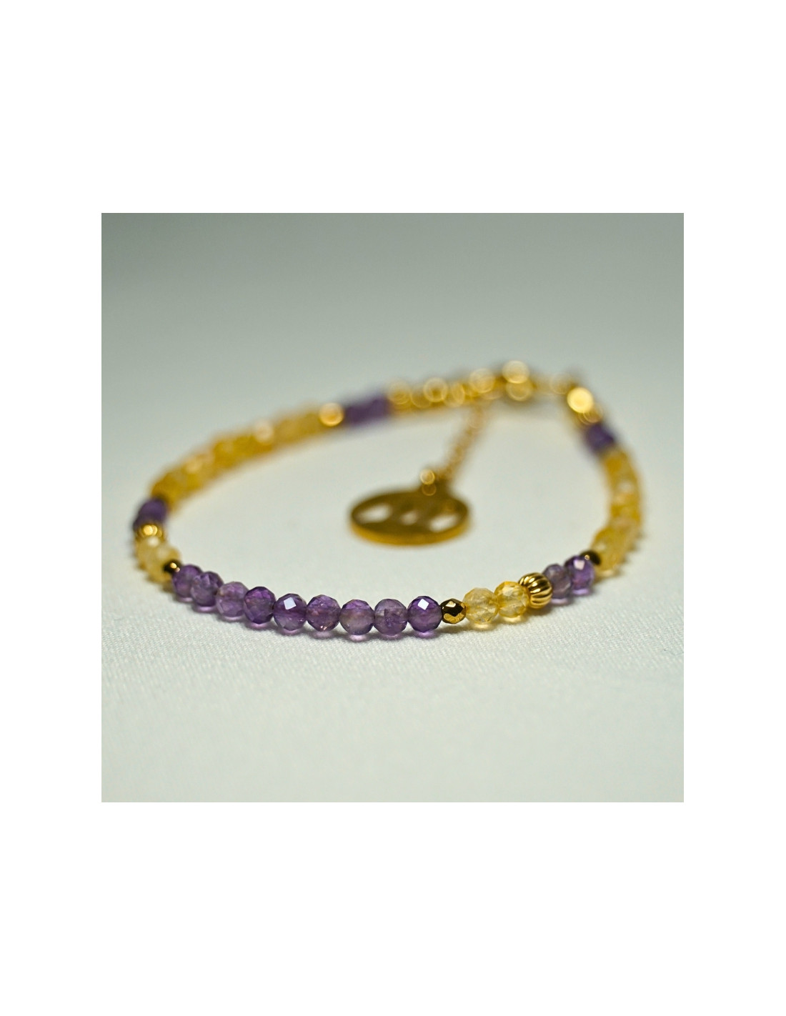 Użyto: Cytryn oraz Ametyst, przekładki, zapięcie oraz przedłużka pozłacane srebro próby 925, zawieszka w formie znaku zodiaku wykonana ze stali chirurgicznej.