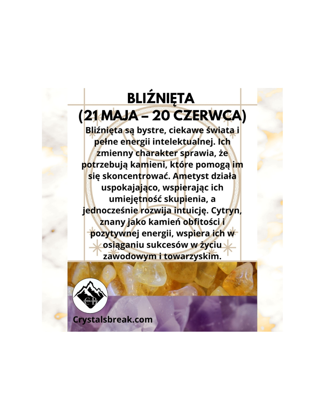 Bliźnięta są bystre, ciekawe świata i pełne energii intelektualnej. Ich zmienny charakter sprawia, że potrzebują kamieni, które pomogą im się skoncentrować. Ametyst działa uspokajająco, wspierając ich umiejętność skupienia, a jednocześnie rozwija intuicję. Cytryn, znany jako kamień obfitości i pozytywnej energii, wspiera ich w osiąganiu sukcesów w życiu zawodowym i towarzyskim.