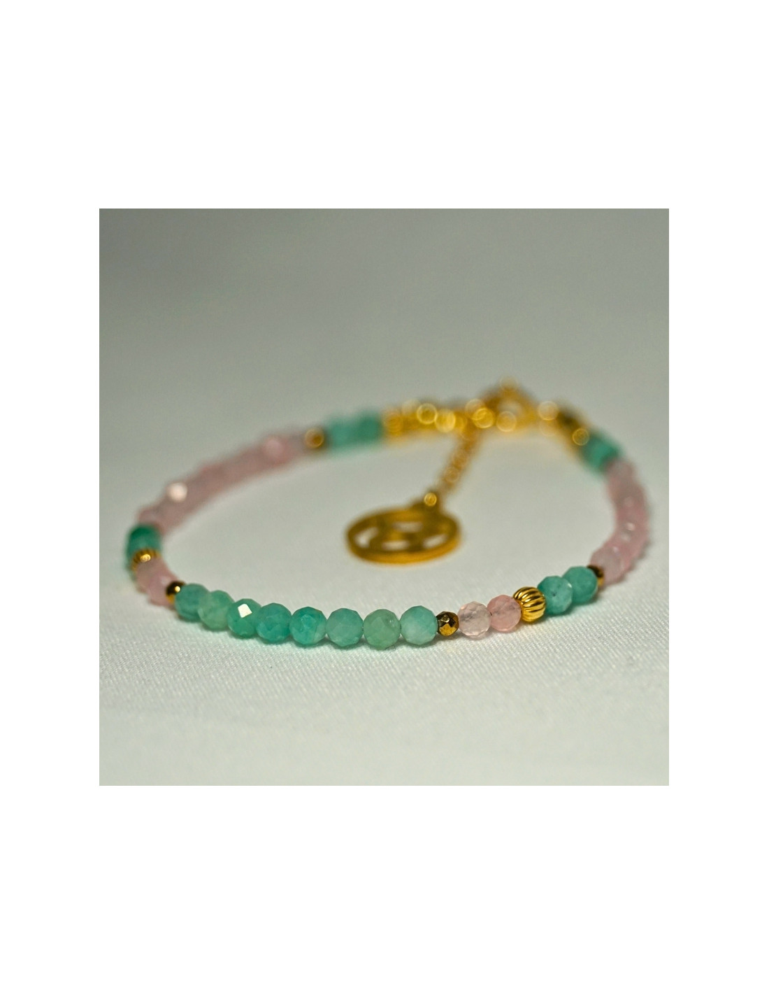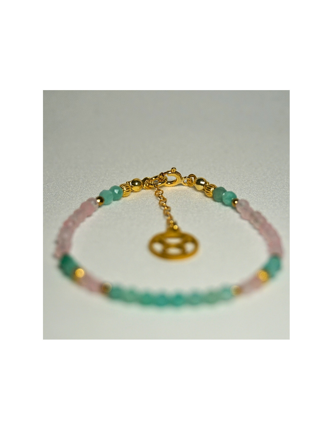 Użyto: Szmaragd jasny oraz Kwarc różowy, przekładki, zapięcie oraz przedłużka pozłacane srebro próby 925, zawieszka w formie znaku zodiaku wykonana ze stali chirurgicznej.