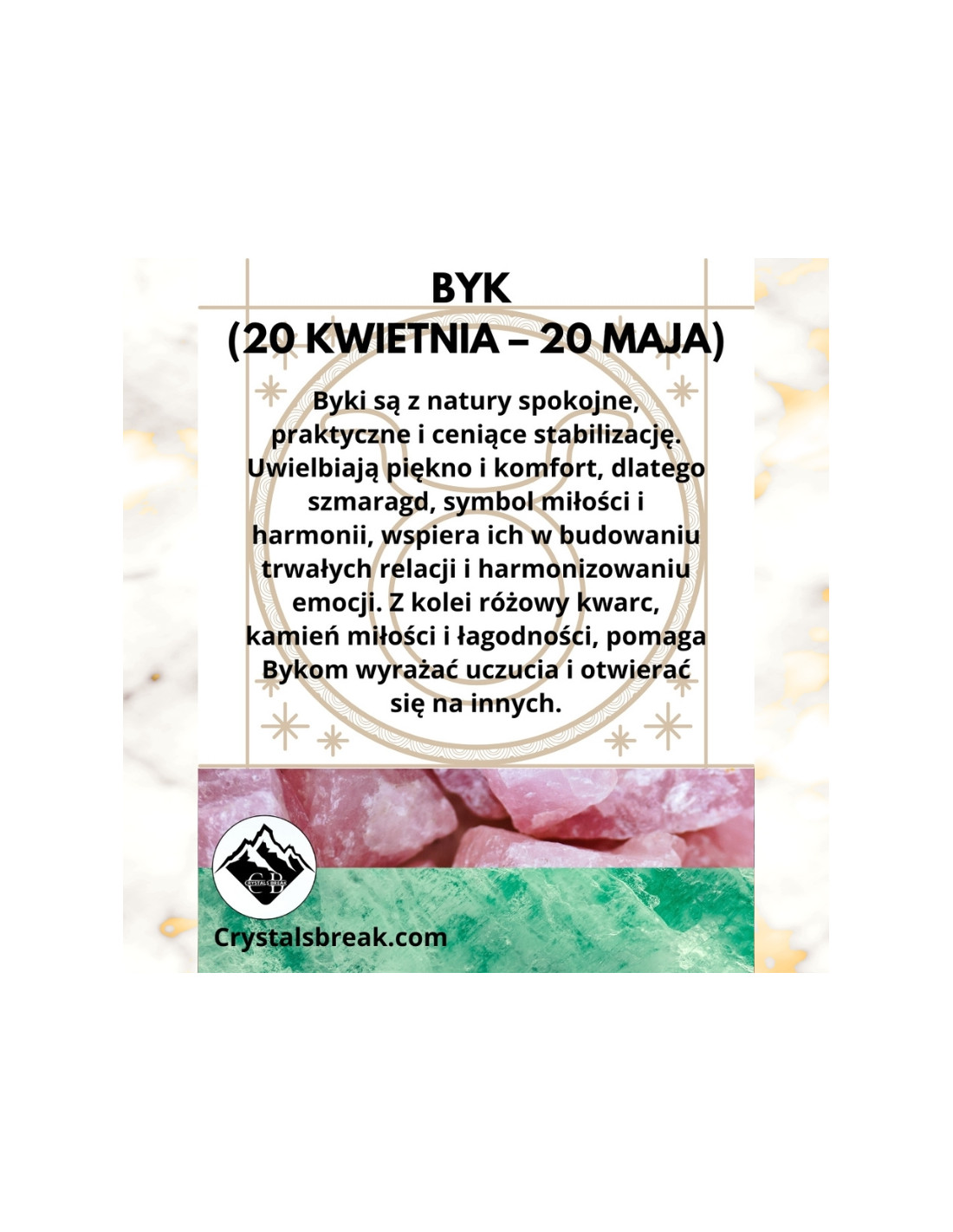 Byki są z natury spokojne, praktyczne i ceniące stabilizację. Uwielbiają piękno i komfort, dlatego szmaragd, symbol miłości i harmonii, wspiera ich w budowaniu trwałych relacji i harmonizowaniu emocji. Z kolei różowy kwarc, kamień miłości i łagodności, pomaga Bykom wyrażać uczucia i otwierać się na innych.