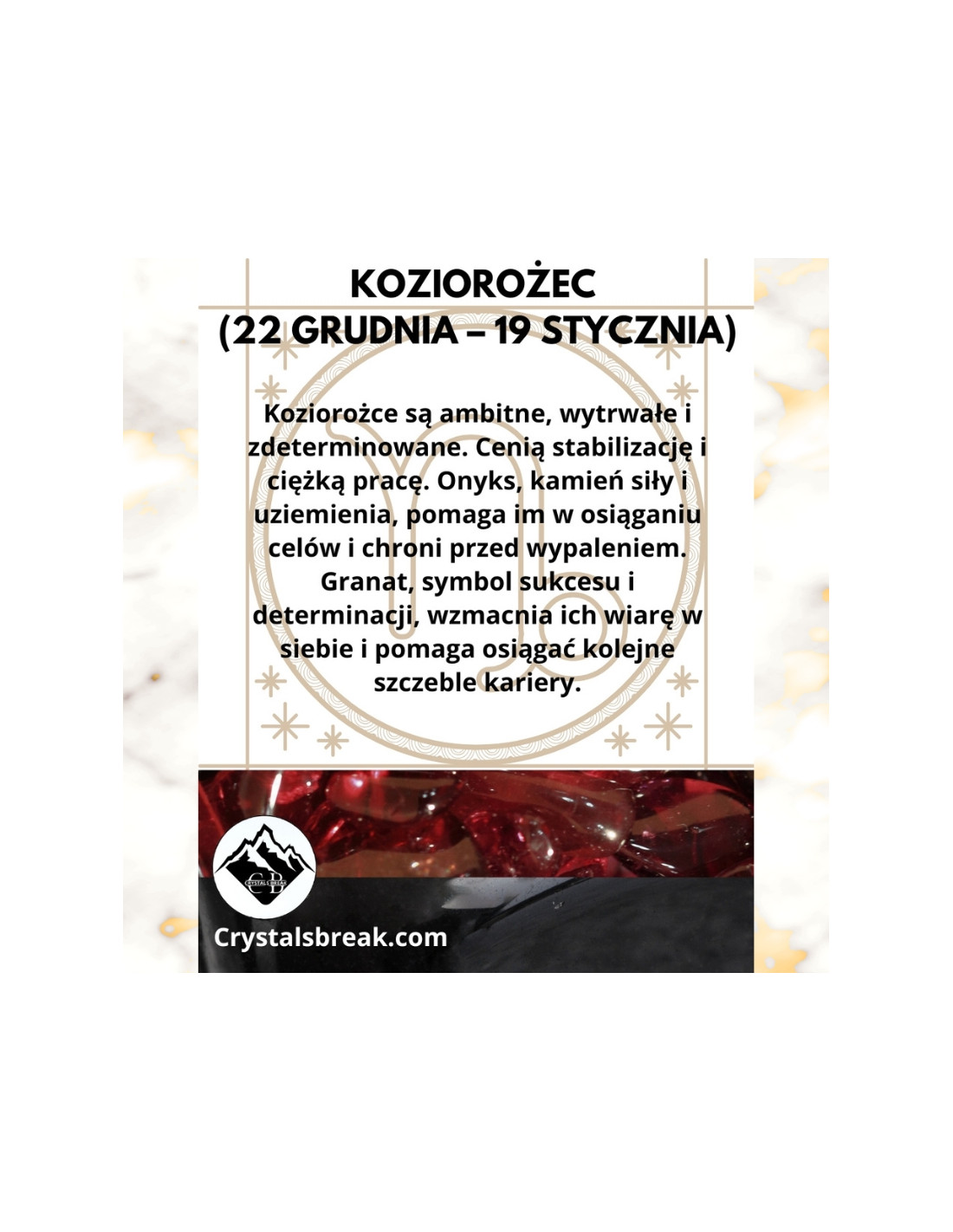 Koziorożce są ambitne, wytrwałe i zdeterminowane. Cenią stabilizację i ciężką pracę. Onyks, kamień siły i uziemienia, pomaga im w osiąganiu celów i chroni przed wypaleniem. Granat, symbol sukcesu i determinacji, wzmacnia ich wiarę w siebie i pomaga osiągać kolejne szczeble kariery.