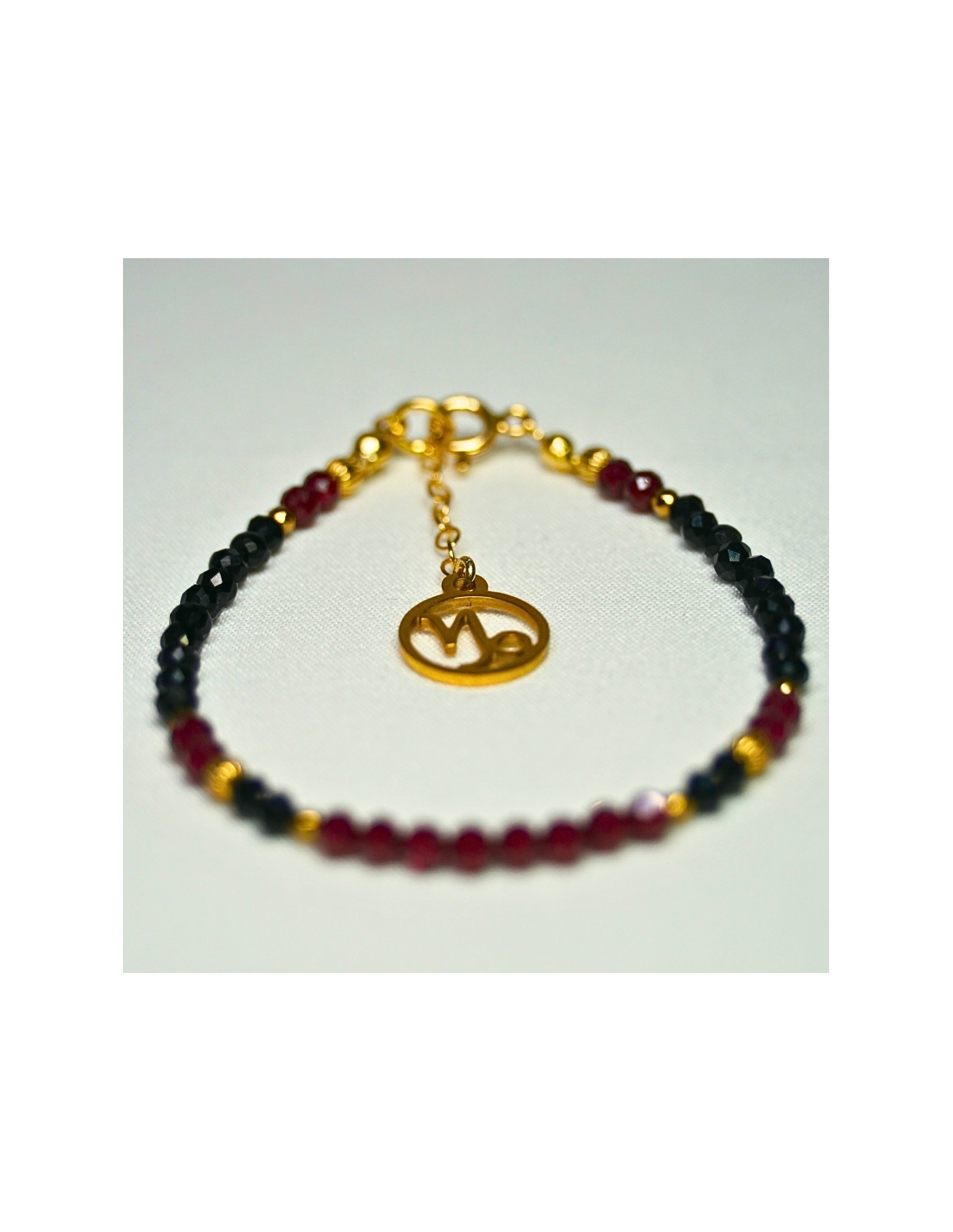 Użyto: Granat oraz Onyks, przekładki, zapięcie oraz przedłużka pozłacane srebro próby 925, zawieszka w formie znaku zodiaku wykonana ze stali chirurgicznej.