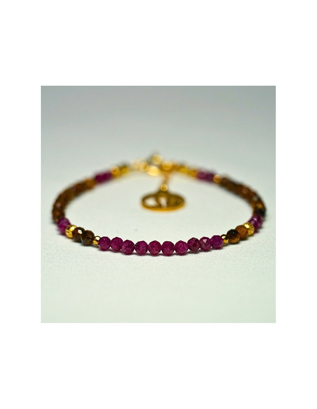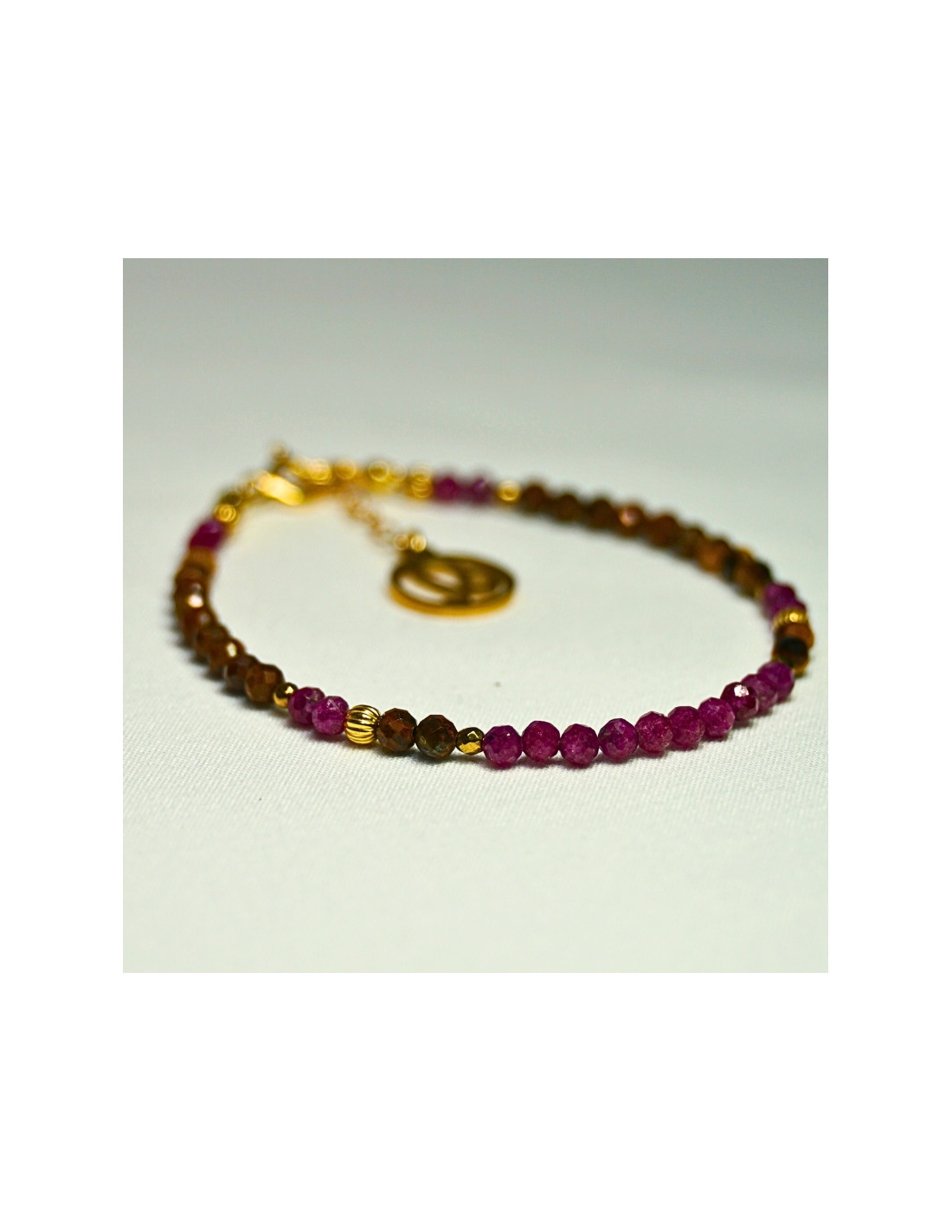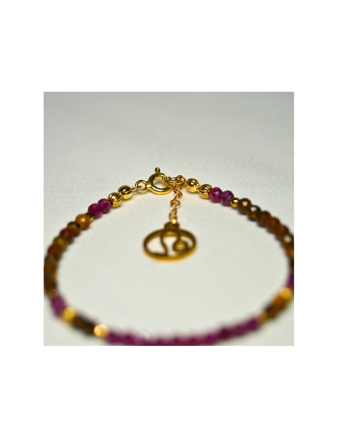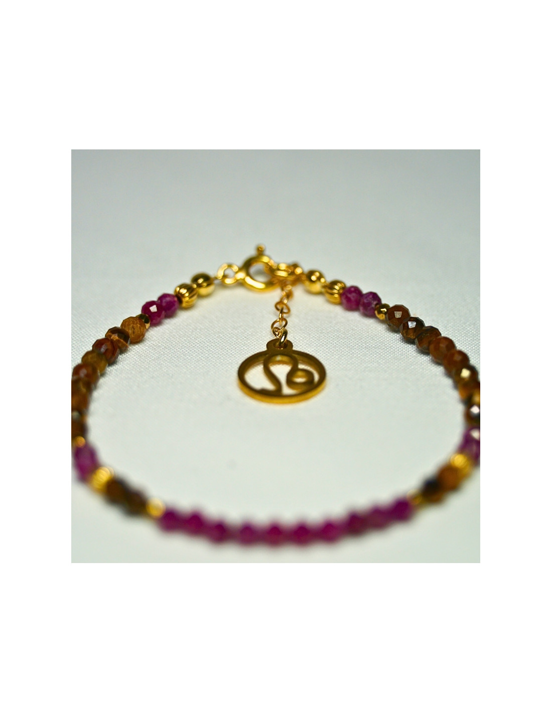 Użyto: Rubin oraz Tygrysie oko, przekładki, zapięcie oraz przedłużka pozłacane srebro próby 925, zawieszka w formie znaku zodiaku wykonana ze stali chirurgicznej.