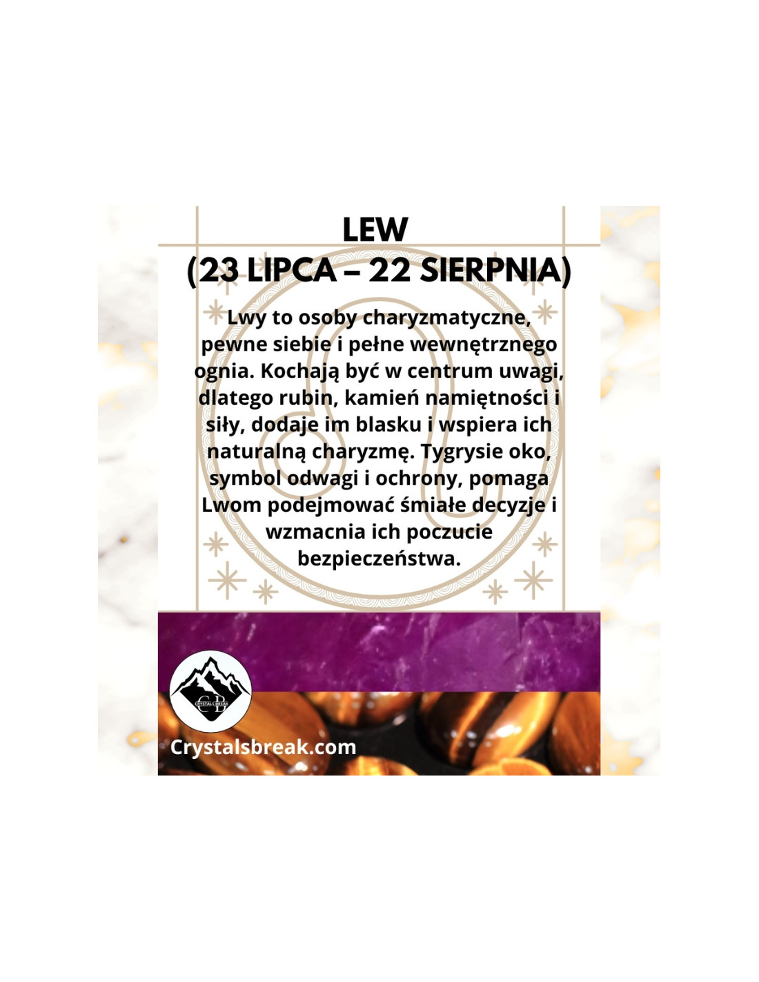 Lwy to osoby charyzmatyczne, pewne siebie i pełne wewnętrznego ognia. Kochają być w centrum uwagi, dlatego rubin, kamień namiętności i siły, dodaje im blasku i wspiera ich naturalną charyzmę. Tygrysie oko, symbol odwagi i ochrony, pomaga Lwom podejmować śmiałe decyzje i wzmacnia ich poczucie bezpieczeństwa.