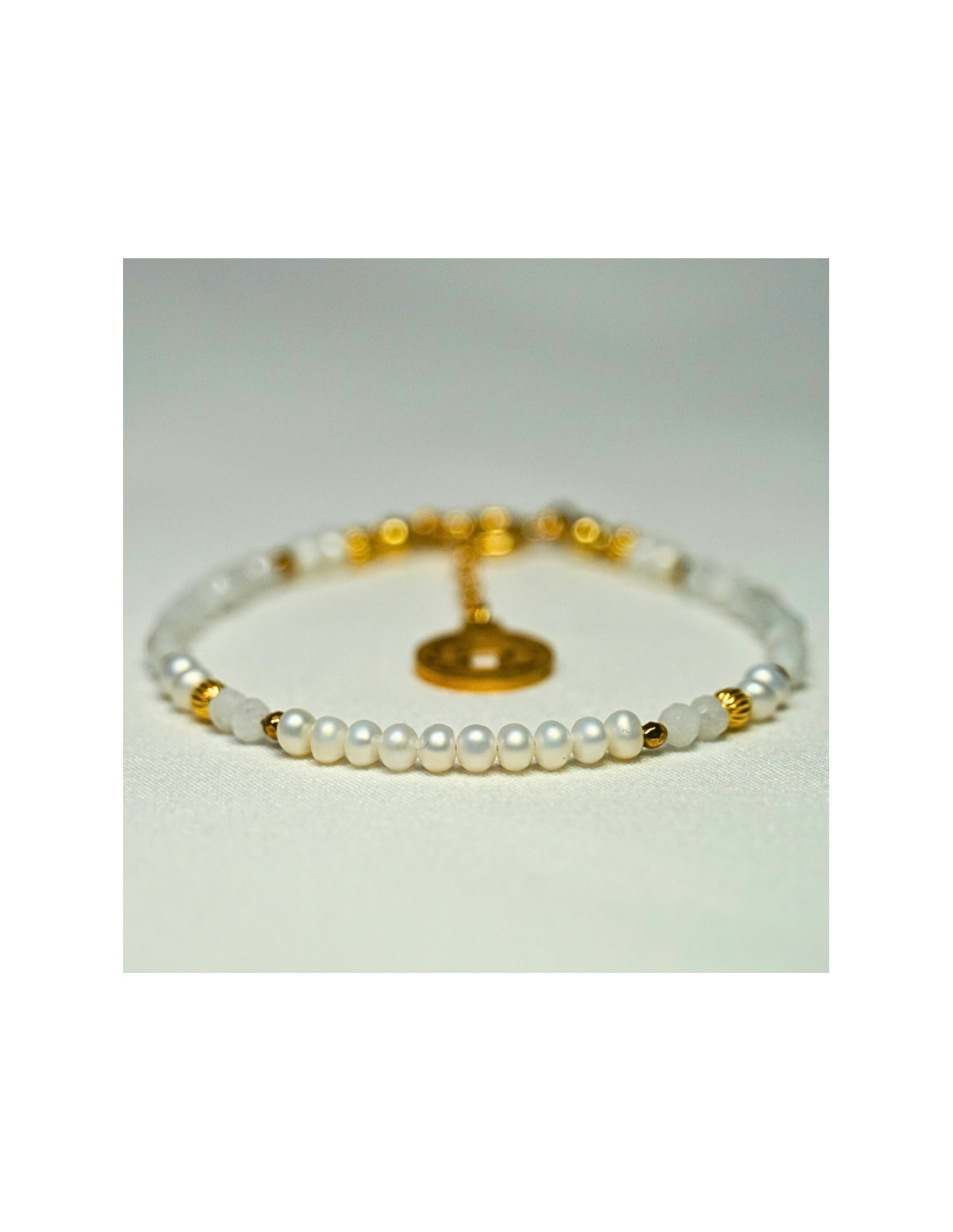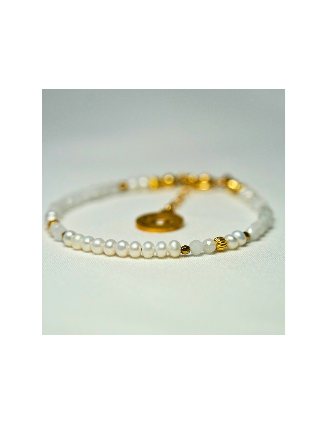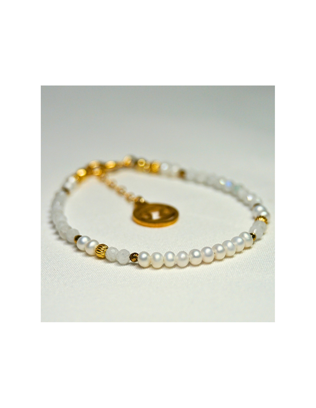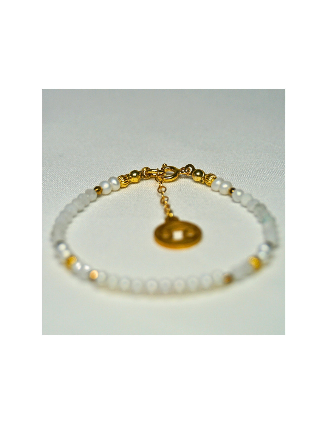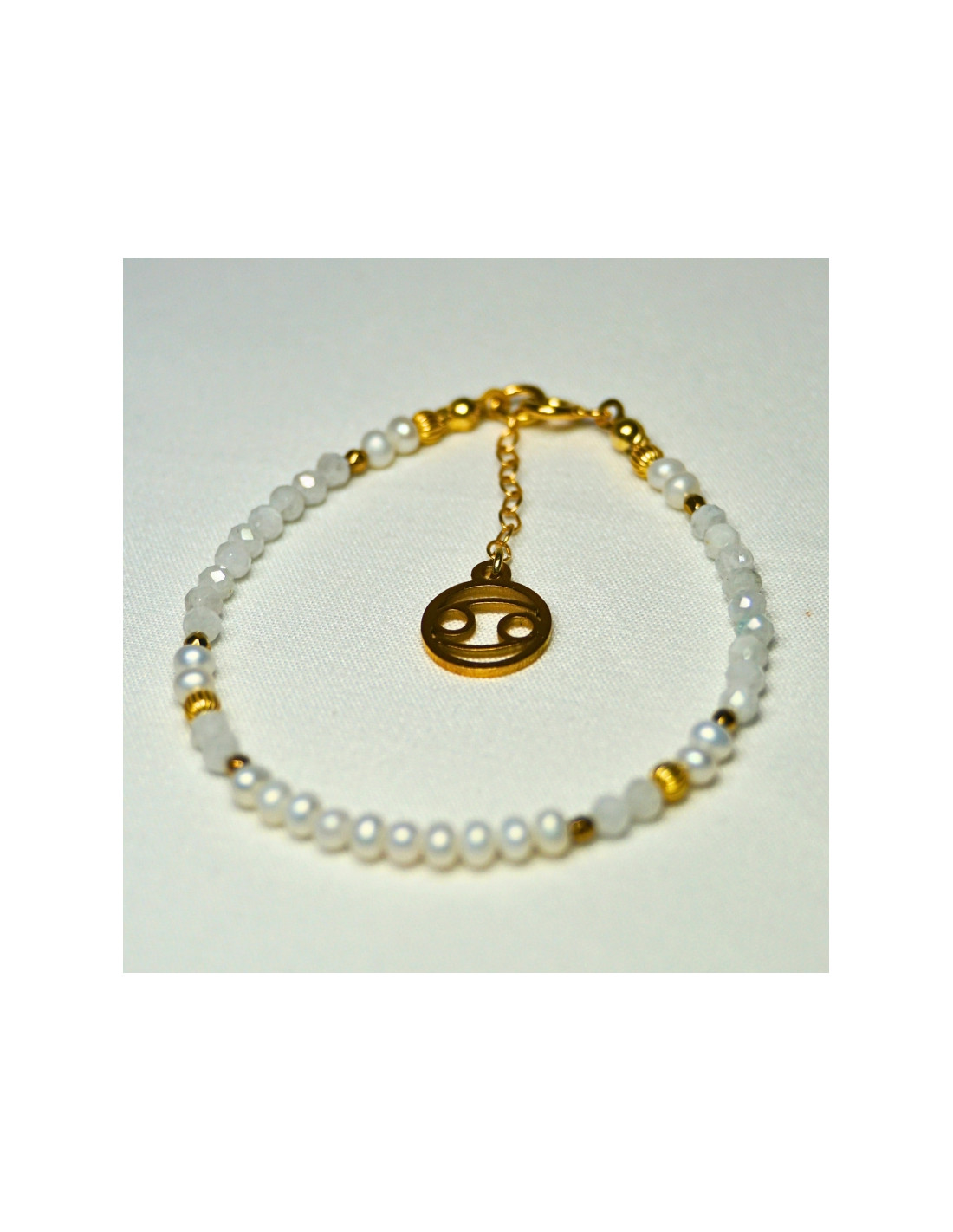 Użyto: Perły oraz Kamień Księżycowy, przekładki, zapięcie oraz przedłużka pozłacane srebro próby 925, zawieszka w formie znaku zodiaku wykonana ze stali chirurgicznej.