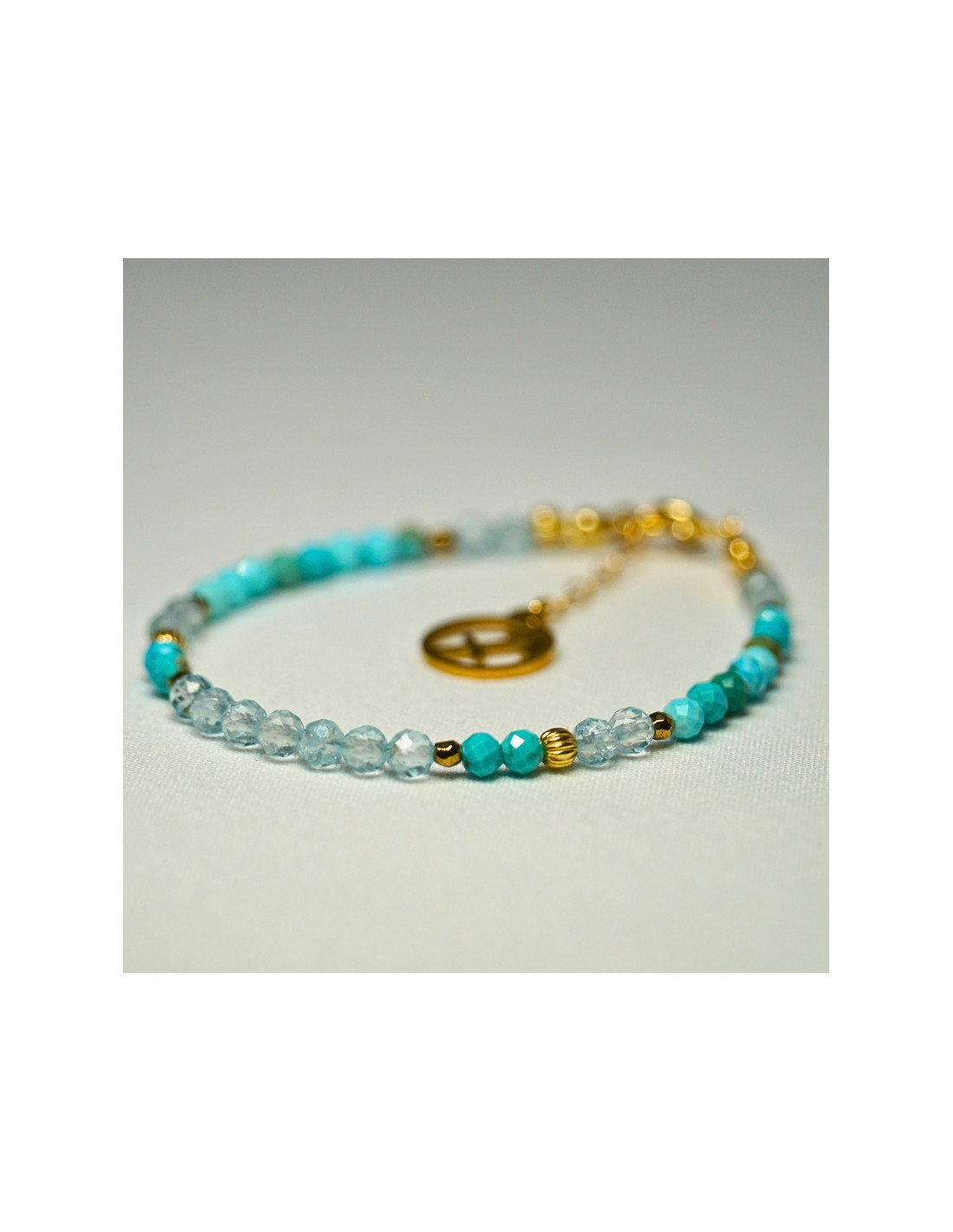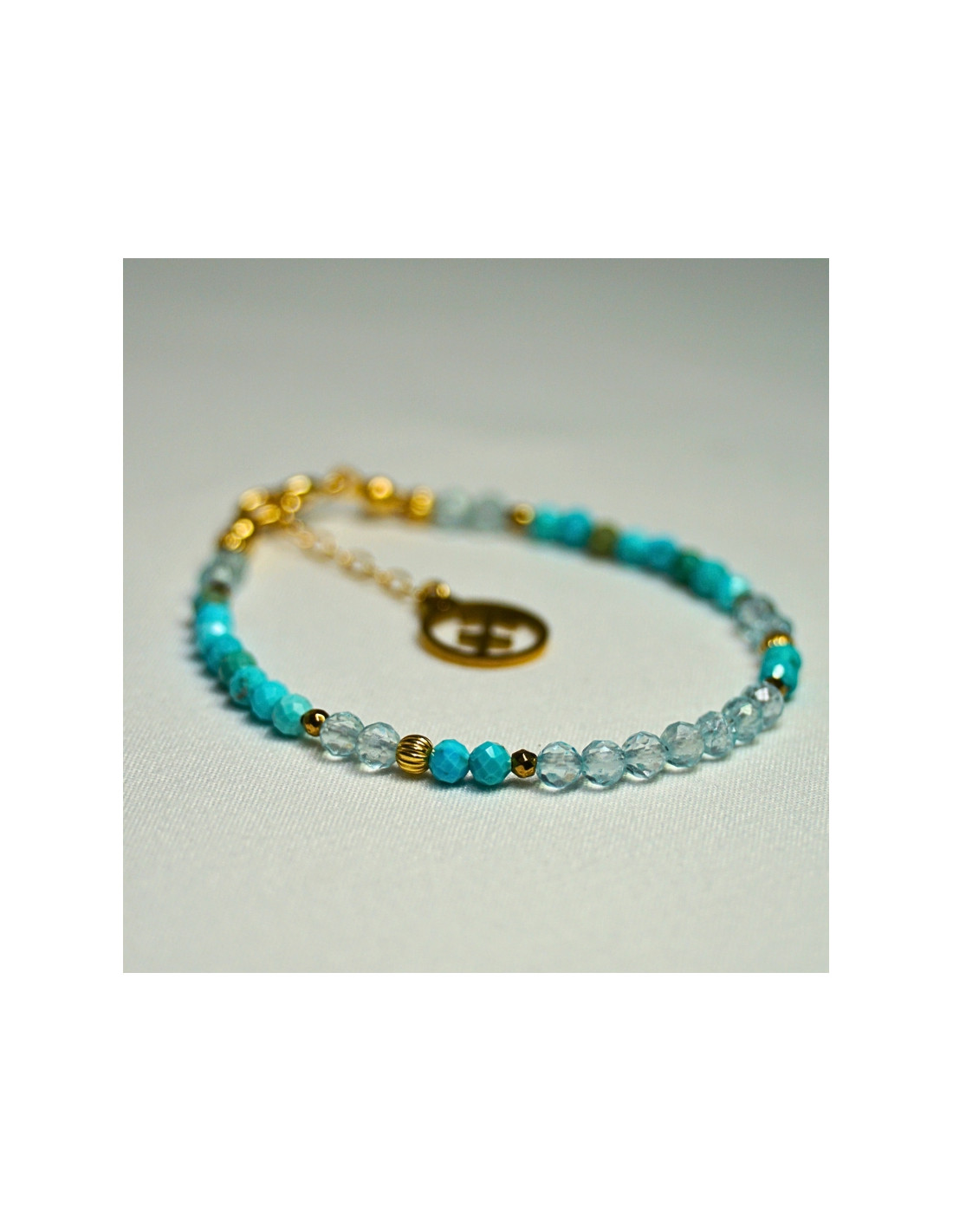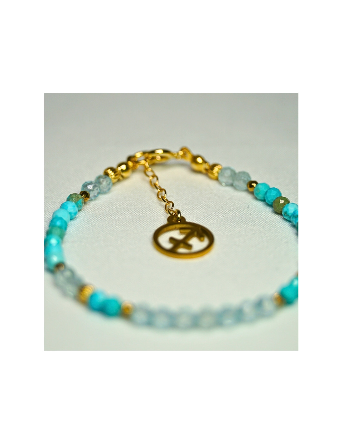 Użyto: Turkus oraz Topaz, przekładki, zapięcie oraz przedłużka pozłacane srebro próby 925, zawieszka w formie znaku zodiaku wykonana ze stali chirurgicznej.