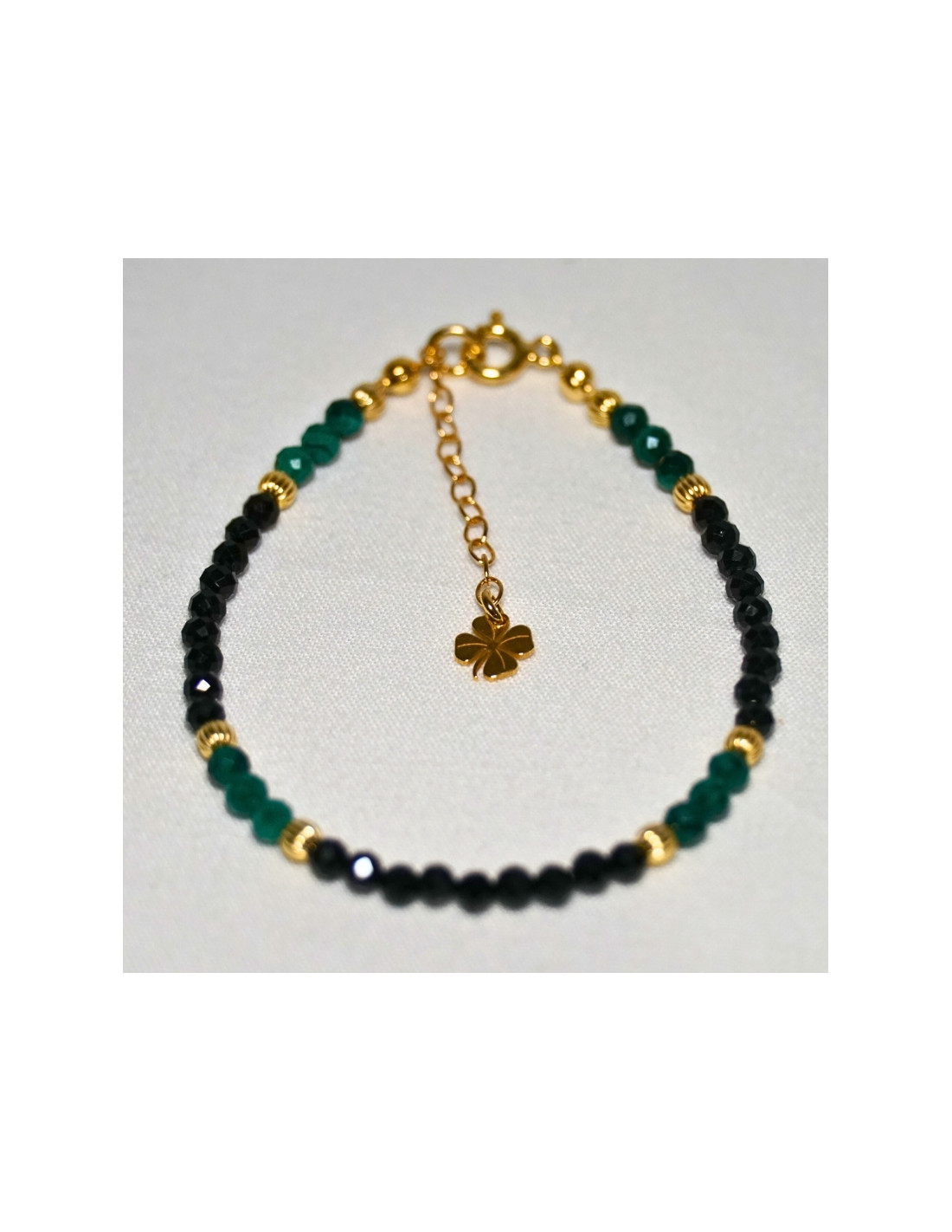 Użyto: Kamień Turmalin Czarny oraz Malachit, przekładki, zapięcie oraz przedłużka pozłacane srebro próby 925, zawieszka w formie koniczynki wykonana z pozłacanego srebra.