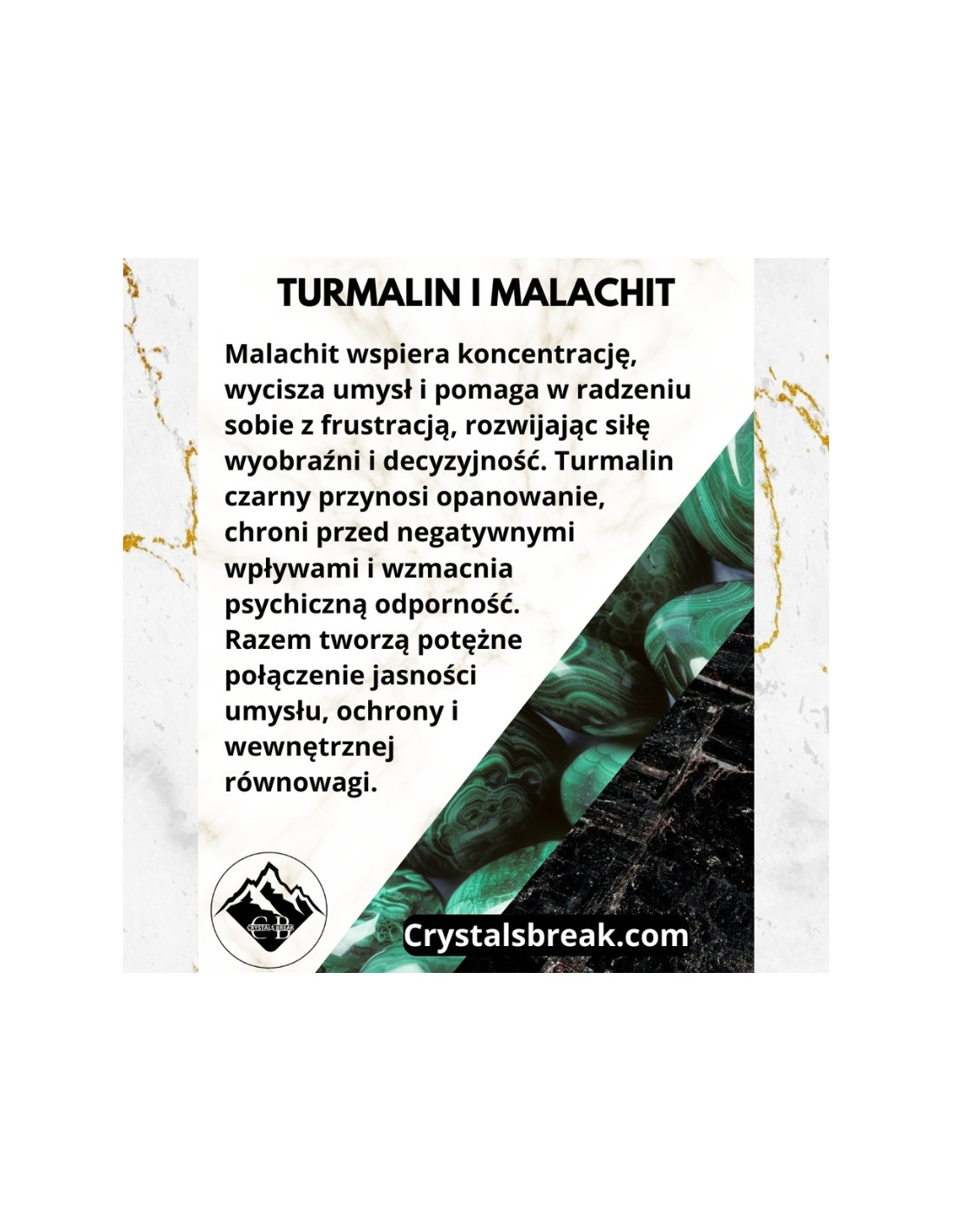 Malachit wspiera koncentrację, wycisza umysł i pomaga w radzeniu sobie z frustracją, rozwijając siłę wyobraźni i decyzyjność. Turmalin czarny przynosi opanowanie, chroni przed negatywnymi wpływami i wzmacnia psychiczną odporność. Razem tworzą potężne połączenie jasności umysłu, ochrony i wewnętrznej równowagi.