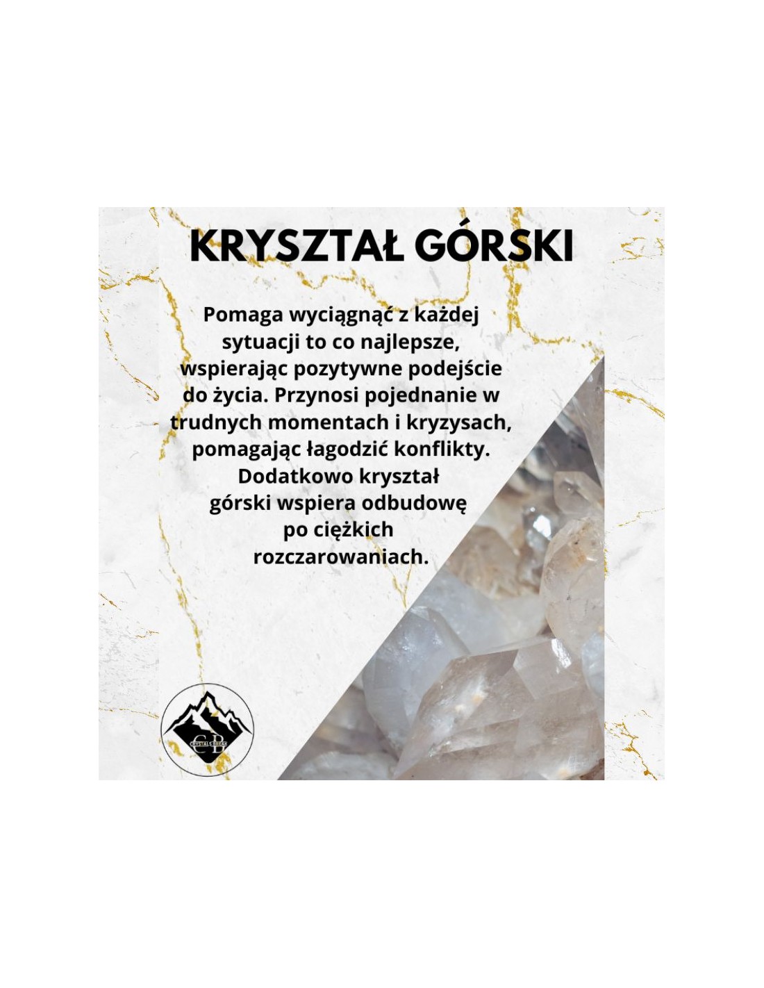 Kryształ górski, nazywany "królem kryształów", jest ceniony za swoje wszechstronne właściwości. Pomaga wyciągnąć z każdej sytuacji to, co najlepsze, wspierając pozytywne podejście do życia. Przynosi pojednanie w trudnych momentach i kryzysach, pomagając łagodzić konflikty. Dodatkowo kryształ górski wspiera odbudowę po ciężkich rozczarowaniach, dając siłę do odzyskania równowagi i wewnętrznego spokoju.