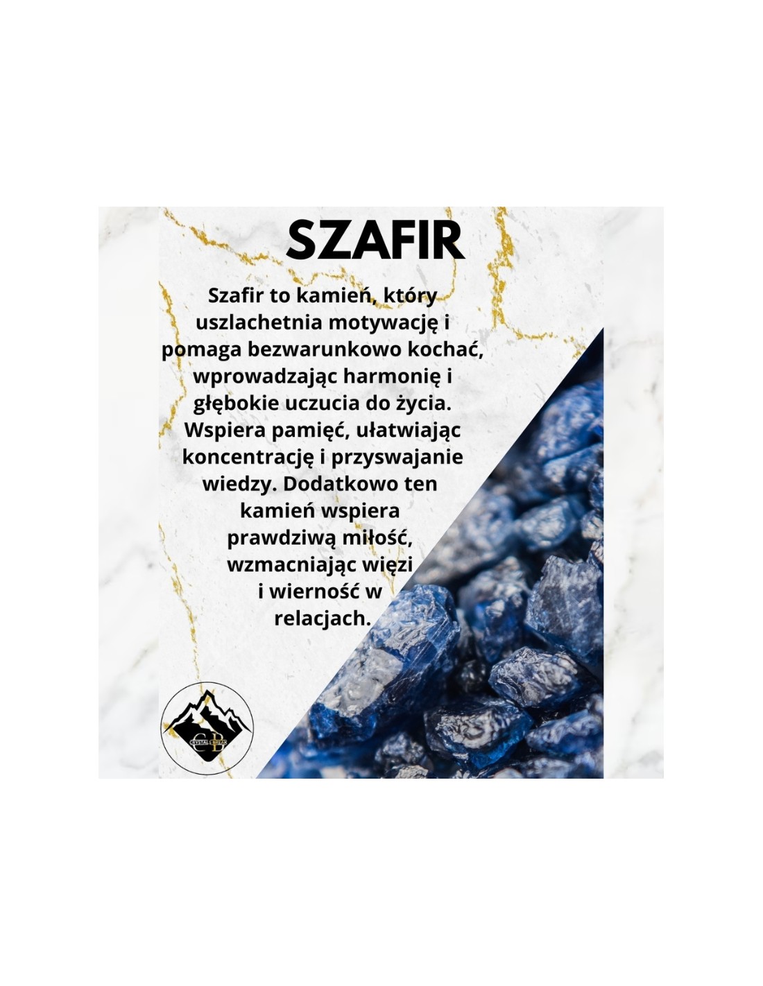 Szafir to kamień, który uszlachetnia motywację i pomaga bezwarunkowo kochać, wprowadzając harmonię i głębokie uczucia do życia. Wspiera pamięć, ułatwiając koncentrację i przyswajanie wiedzy. Szafir kieruje myśli na wyznaczone cele, pomagając je osiągnąć z determinacją i klarownością. Dodatkowo ten kamień wspiera prawdziwą miłość, wzmacniając więzi i wierność w relacjach.