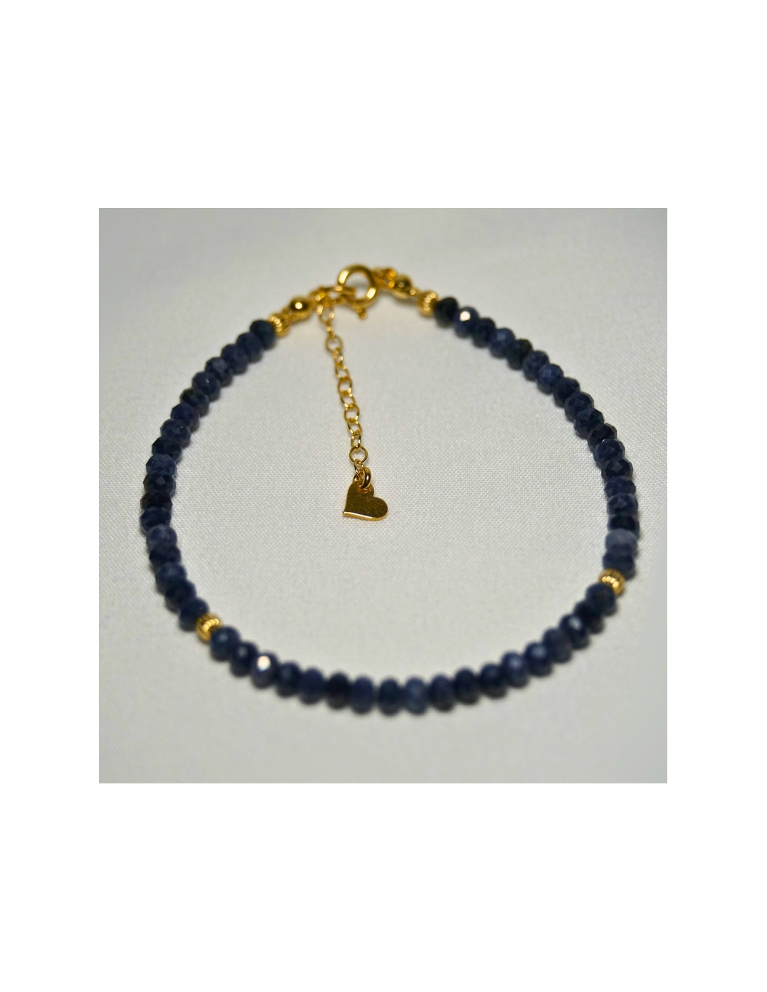 Użyto: Kamień szlachetny Szafir, przekładki, zapięcie oraz przedłużka pozłacane srebro próby 925, zawieszka w formie serduszka wykonana z pozłacanego srebra.