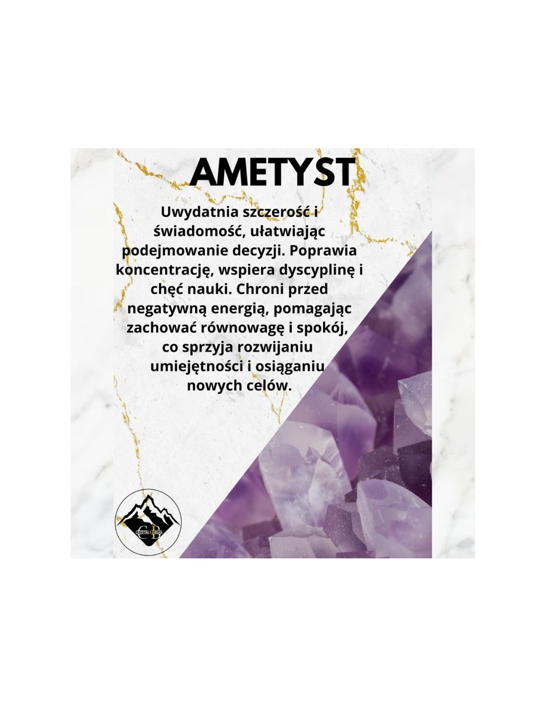 Ametyst jest kamieniem, który uwydatnia szczerość, trzeźwość i świadomość, ułatwiając podejmowanie decyzji. Jego energia poprawia koncentrację, wspierając dyscyplinę i chęć nauki. Ametyst również chroni przed przyjmowaniem energii innych ludzi, pomagając utrzymać wewnętrzną równowagę i spokój. Jest niezastąpionym sprzymierzeńcem dla tych, którzy pragną rozwijać swoje umiejętności i osiągać nowe cele.