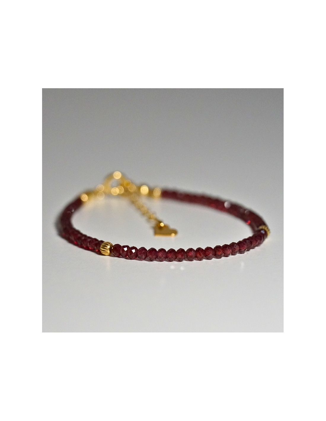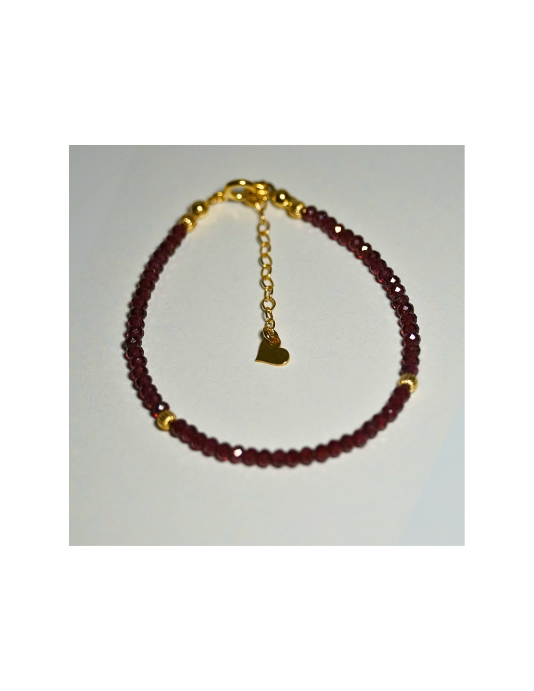 Użyto: Kamień Granat, przekładki, zapięcie oraz przedłużka pozłacane srebro próby 925, zawieszka w formie serduszka wykonana z pozłacanego srebra.