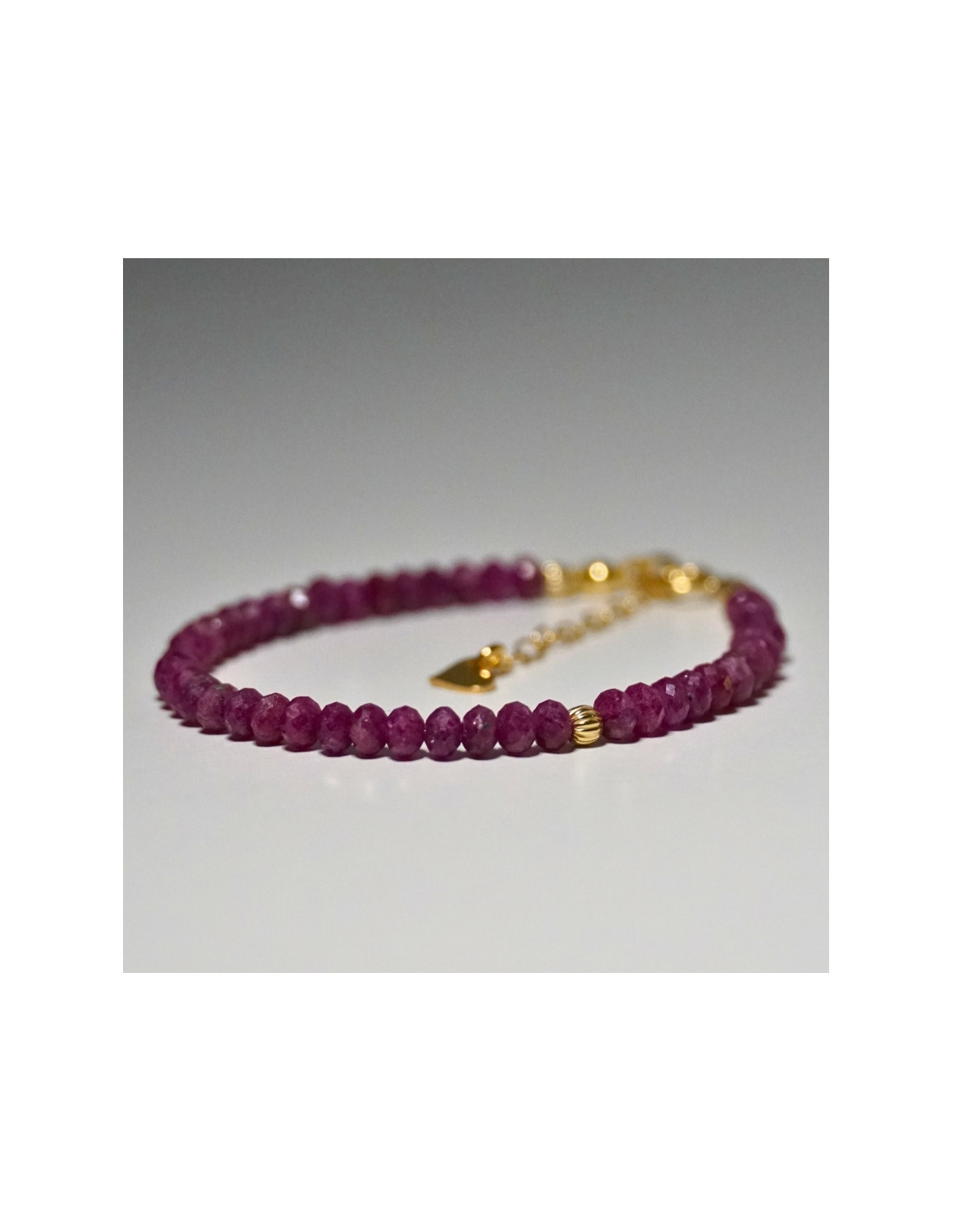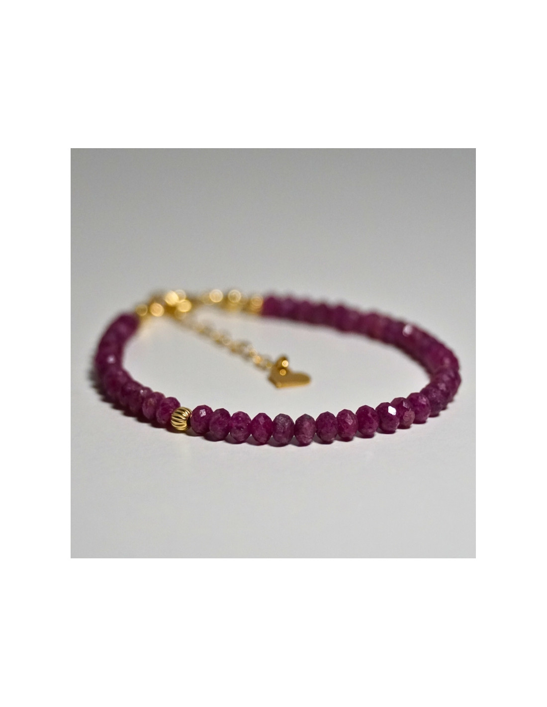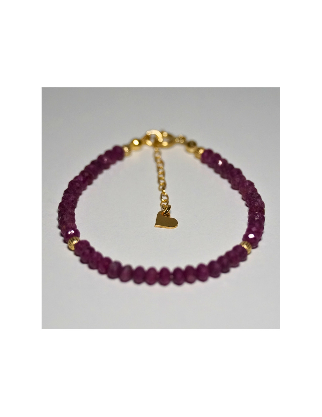 Użyto: Kamień szlachetny Rubin, przekładki, zapięcie oraz przedłużka pozłacane srebro próby 925, zawieszka w formie serduszka wykonana z pozłacanego srebra.