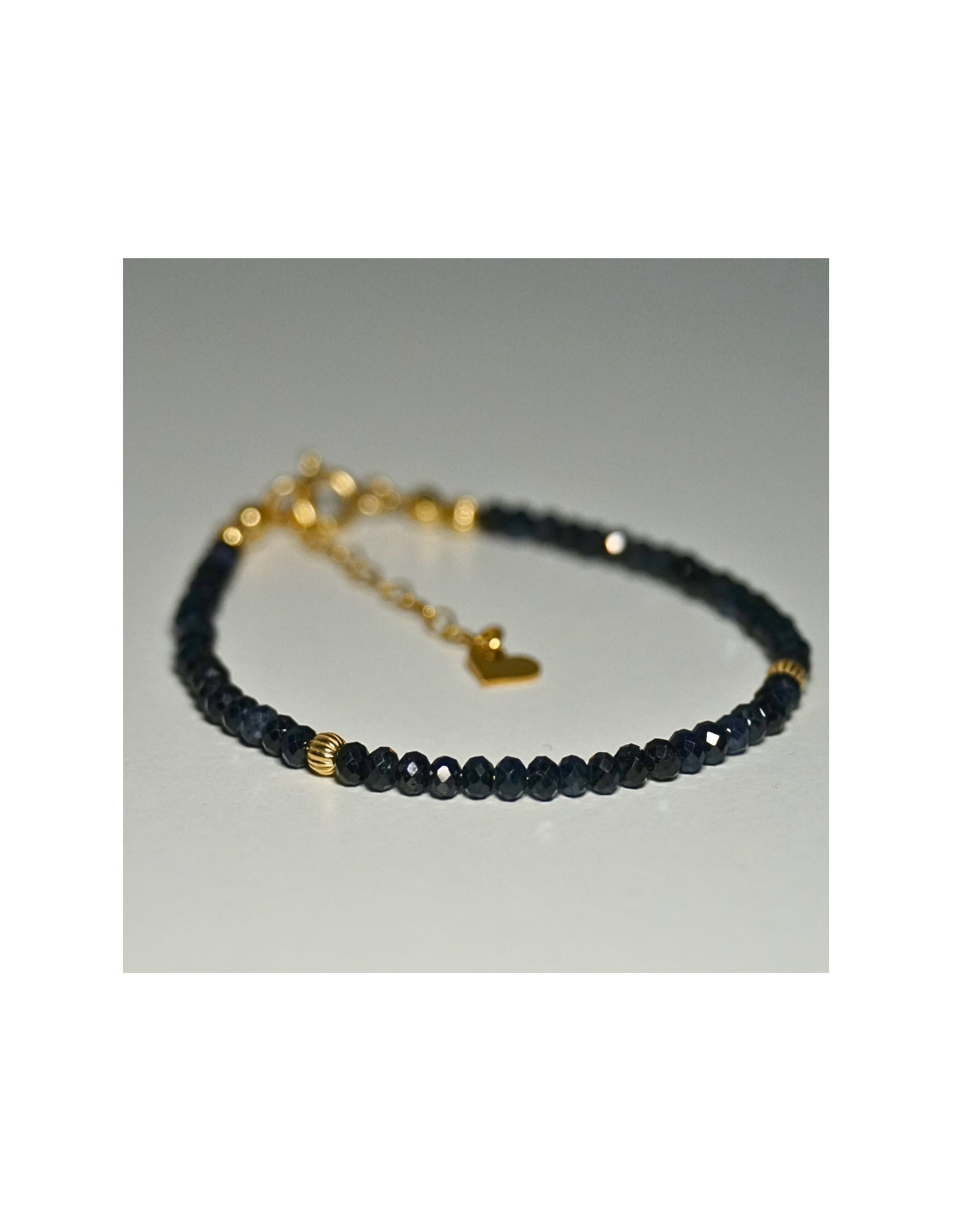 Użyto: Kamień szlachetny Szafir ciemny, przekładki, zapięcie oraz przedłużka pozłacane srebro próby 925, zawieszka w formie serduszka wykonana z pozłacanego srebra.