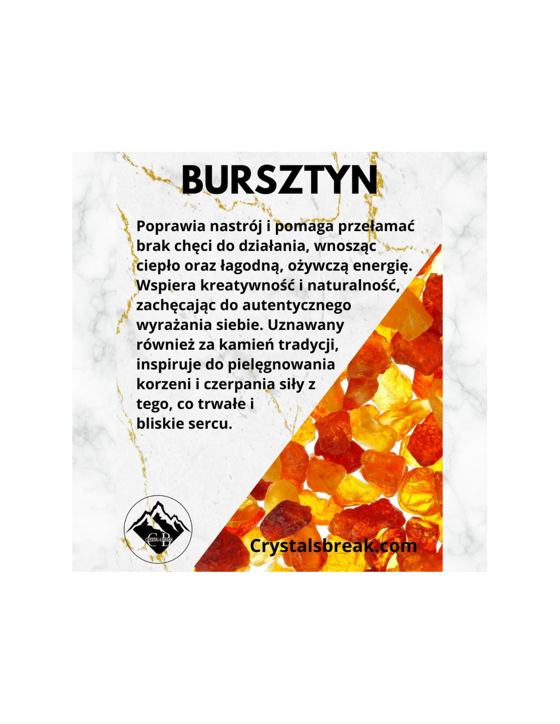 Bursztyn poprawia nastrój i pomaga przełamać brak chęci do działania, wnosząc ciepło oraz łagodną, ożywczą energię. Wspiera kreatywność i naturalność, zachęcając do autentycznego wyrażania siebie. Uznawany również za kamień tradycji, inspiruje do pielęgnowania korzeni i czerpania siły z tego, co trwałe i bliskie sercu.