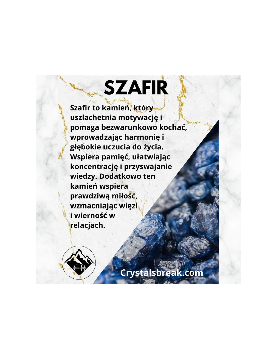 Szafir to kamień, który uszlachetnia motywację i pomaga bezwarunkowo kochać, wprowadzając harmonię i głębokie uczucia do życia. Wspiera pamięć, ułatwiając koncentrację i przyswajanie wiedzy. Szafir kieruje myśli na wyznaczone cele, pomagając je osiągnąć z determinacją i klarownością. Dodatkowo ten kamień wspiera prawdziwą miłość, wzmacniając więzi i wierność w relacjach.