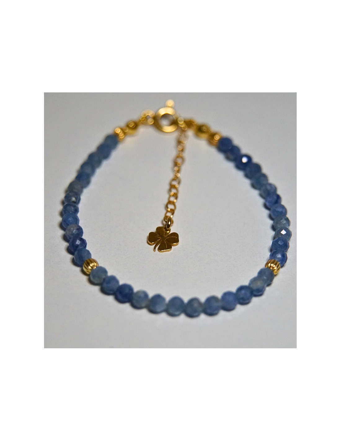 Użyto: Kamień szlachetny Szafir jasny, przekładki, zapięcie oraz przedłużka pozłacane srebro próby 925, zawieszka w formie koniczynki wykonana z pozłacanego srebra.