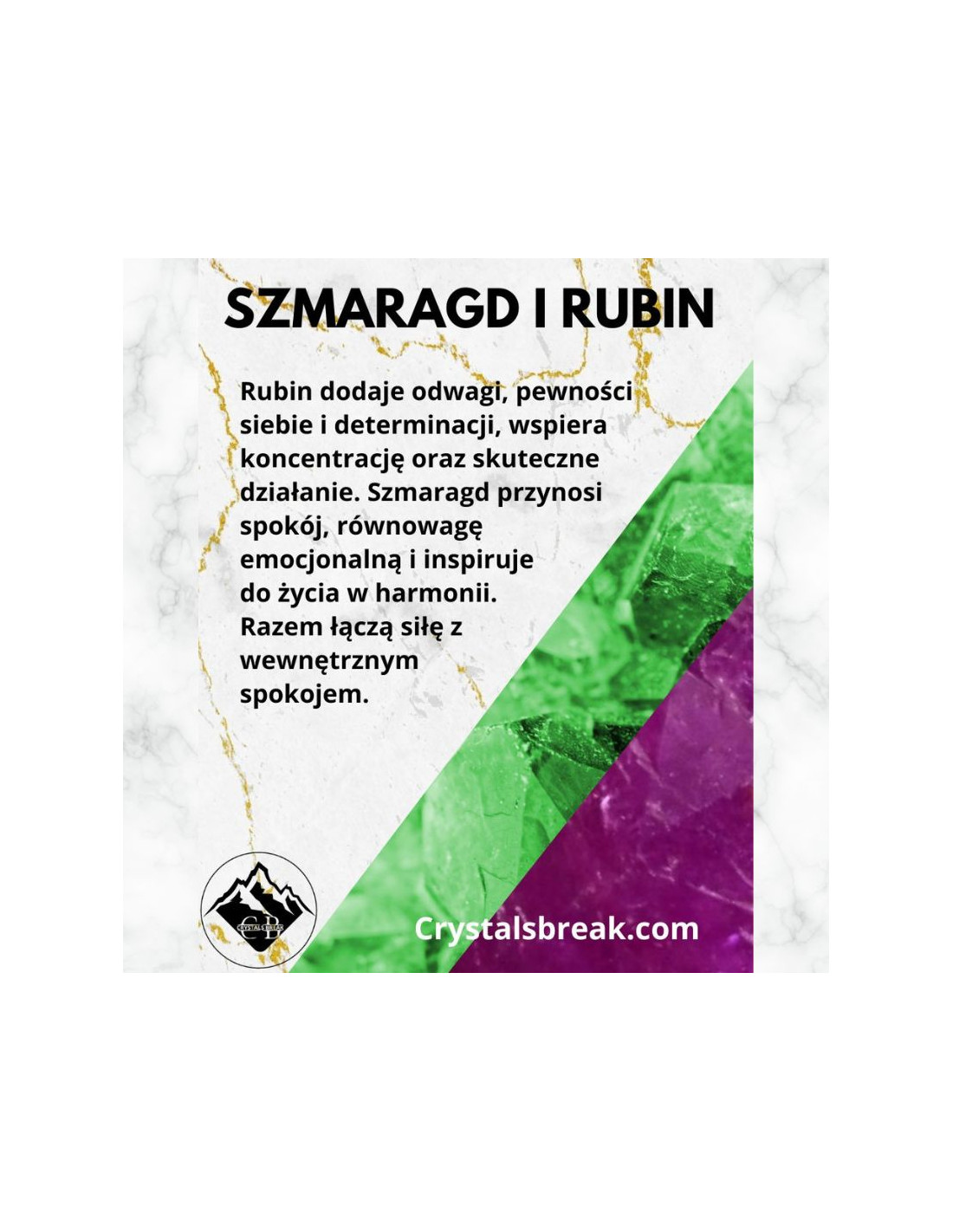 Rubin wzmacnia wewnętrzną siłę, dodaje odwagi, pewności siebie i determinacji. Pomaga skupić się na celach, zwiększa wydajność i chroni przed dekoncentracją. Szmaragd przynosi spokój oraz równowagę emocjonalną, łagodzi nerwowość i wzmacnia wolę działania. Inspiruje do życia w harmonii i otaczania się pięknem. Razem łączą moc działania z wewnętrznym spokojem.