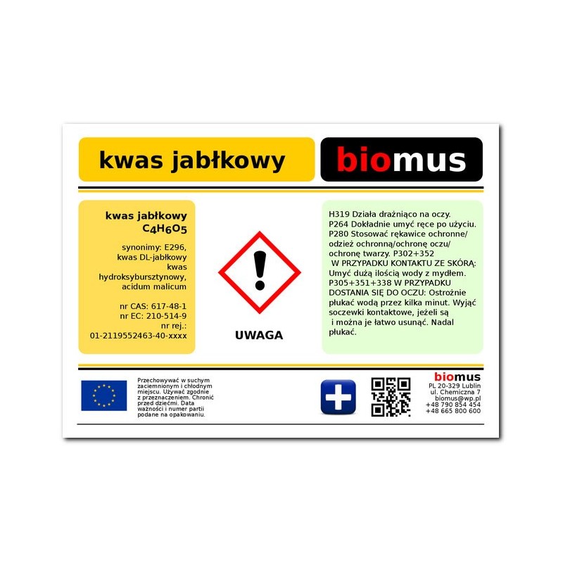 Synonimy: kwas hydroksybursztynowy, łac. Acidum malicum, E296