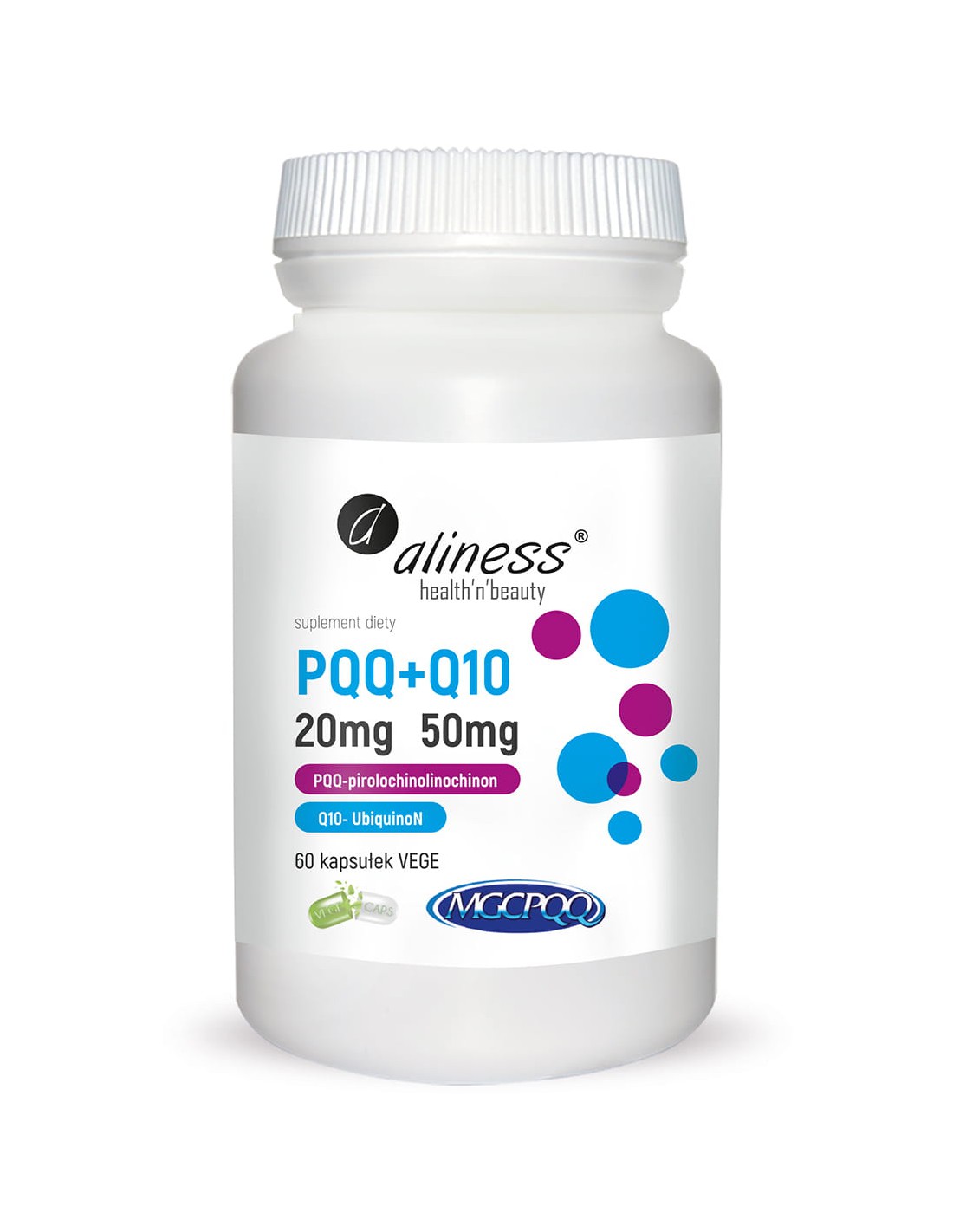 Aliness PQQ MGCPQQ® +Q10 stanowi połączenie pirolochinolinochinonu i koenzymu Q10 - dwóch składników o silnym działaniu antyoksydacyjnym. Ze względu na szerokie zastosowanie prozdrowotne i pozytywny wpływ na organizm poczynając od poziomu mitochondrialnego, produkt polecany jest osobom pragnącym kompleksowo zadbać o zdrowie i kondycję swojego organizmu.