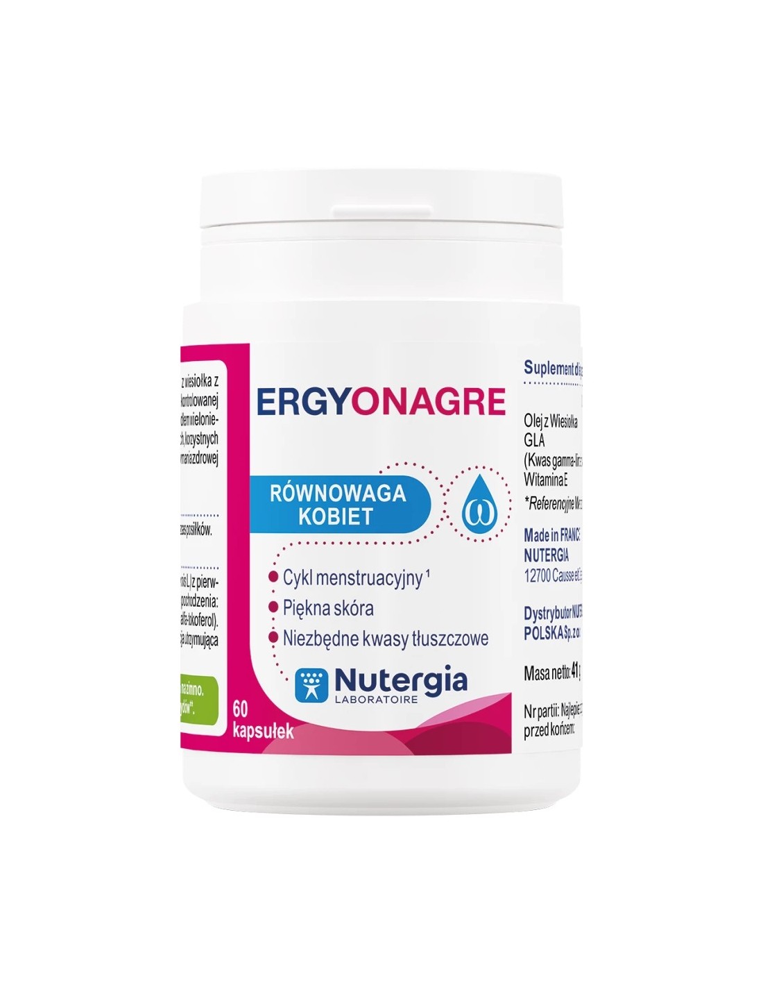 ERGYONAGRE powstaje z nierafinowanego oleju z wiesiołka uzyskanego w wyniku prostego mechanicznego tłoczenia na zimno, co daje gwarancję jakości. Dzięki temu olej zachowuje wszystkie korzystne wartości i pomaga zapewnić właściwe spożycie wielonienasyconych kwasów tłuszczowych kobietom pragnącym zachować prawidłowe cykle miesięczne oraz piękną skórę. Korzystny efekt uzyskuje się po spożyciu 6000 mg oleju z wiesiołka.