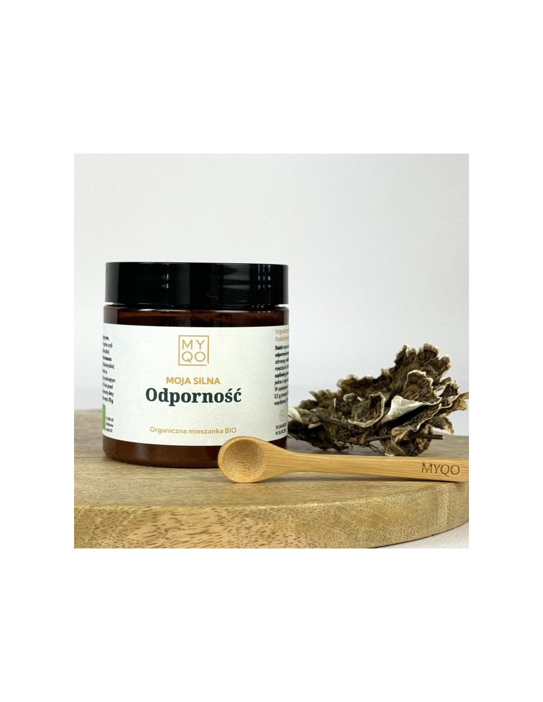 MOJA SILNA ODPORNOŚĆ to wyjątkowa organiczna mieszanka, stworzona przez Panią profesor Bożenę Muszyńską, to tarcza ochronna. Kompozycja czterech adaptogennych grzybów: Reishi, Soplówka jeżowata (Hericium), Cordyceps i Wrośniak różnobarwny (Coriolus) w unikalny sposób wspiera naszą naturalną funkcję układu odpornościowego. Mieszanka przydaje się przez cały rok, ale szczególnie polecamy ją w okresach przejściowych i w zimie, kiedy jesteśmy najbardziej podatni na infekcje.