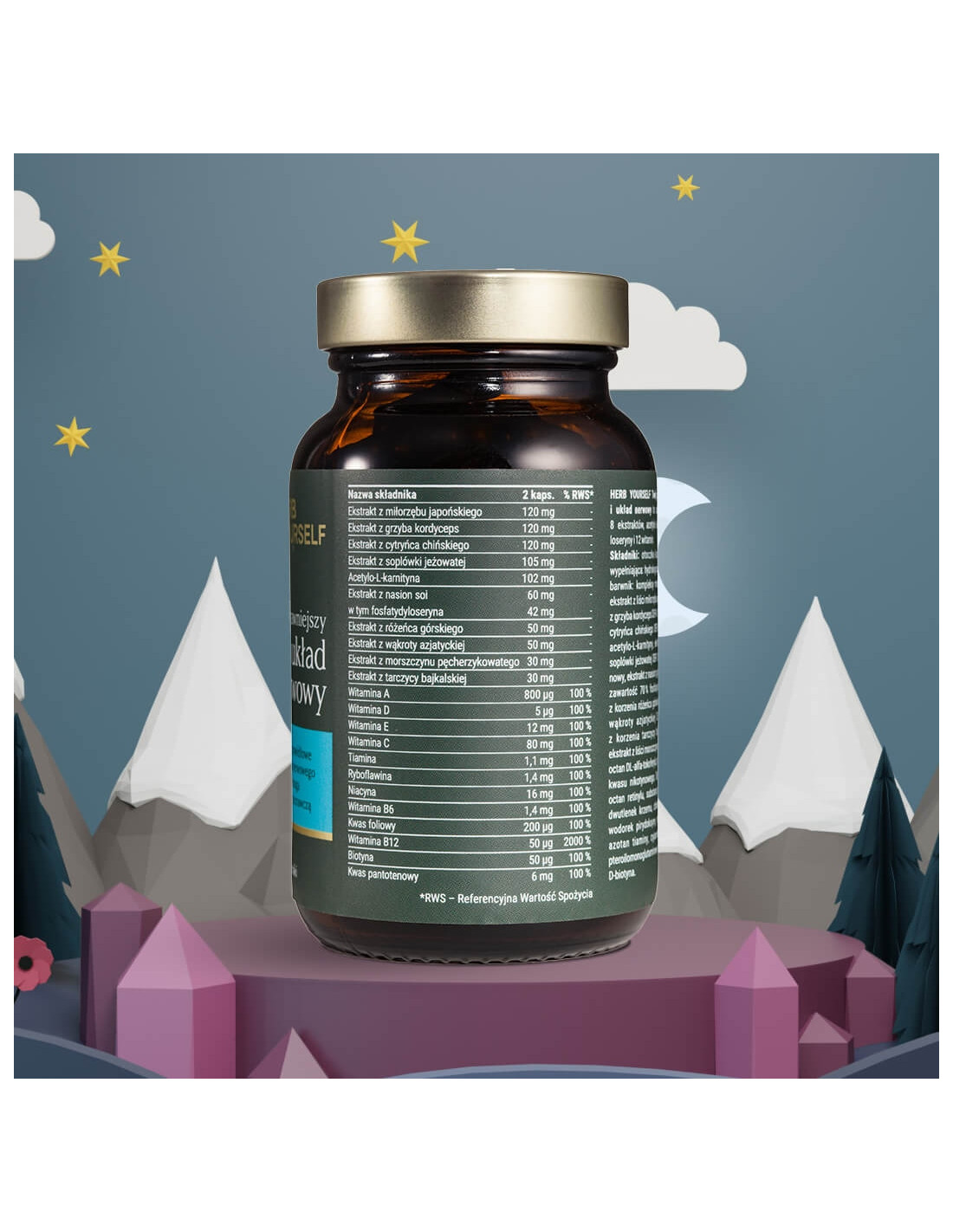 HERB YOURSELF Twój sprawniejszy mózg i układ nerwowy to synergistyczne połączenie 22 składników: 8 ekstraktów, acetyl L-karnityny, fosfatydyloseryny i 12 witamin.