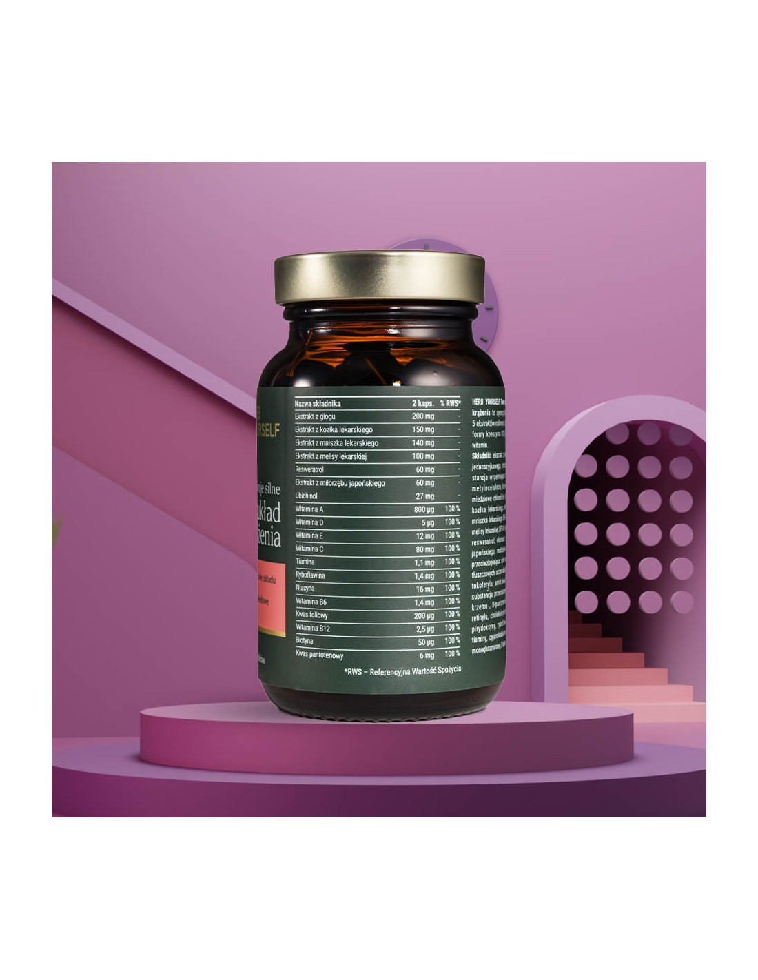 HERB YOURSELF Twoje silniejsze serce i układ krążenia to synergistyczne połączenie 19 składników: 5 ekstraktów roślinnych, ubichinolu (aktywnej formy koenzymu Q10), resweratrolu i 12 witamin.