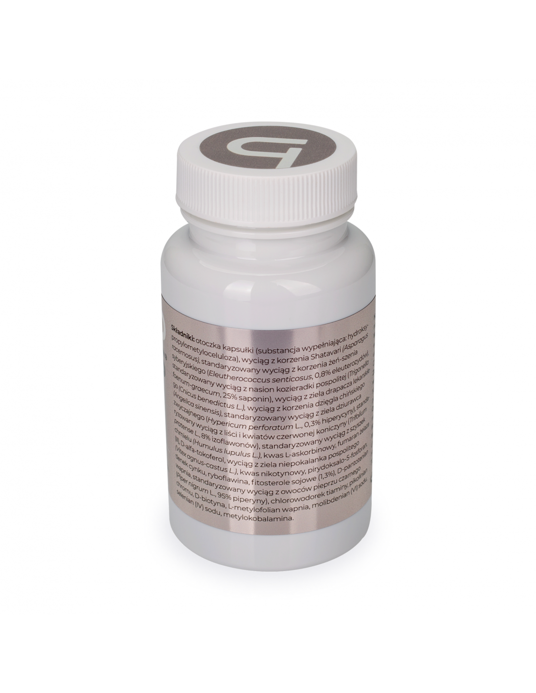 Składniki: otoczka kapsułki (substancja wypełniająca: hydroksypropylometyloceluloza), wyciąg z korzenia Shatavari (Asparagus racemosus), standaryzowany wyciąg z korzenia żeń-szenia syberyjskiego (Eleutherococcus senticosus, 0,8% eleuterozydów), standaryzowany wyciąg z nasion kozieradki pospolitej (Trigonella foenum-graecum, 25% saponin), wyciąg z ziela drapacza lekarskiego (Cnicus benedictus L.), wyciąg z korzenia dzięgla chińskiego (Angelica sinensis), standaryzowany wyciąg z ziela dziurawca zwyczajnego (Hypericum perforatum L., 0,3% hiperycyny), standaryzowany wyciąg z liści i kwiatów czerwonej koniczyny (Trifolium pratense L., 8% izoflawonów), standaryzowany wyciąg z szyszek chmielu (Humulus lupulus L.), kwas L-askorbinowy, fumaran żelaza (II), D-alfa-tokoferol, wyciąg z ziela niepokalanka pospolitego (Vitex agnus-castus L.), kwas nikotynowy, pirydoksalo-5-fosforan, tlenek cynku, ryboflawina, fitosterole sojowe (1,3%), D-pantotenian wapnia, standaryzowany wyciąg z owoców pieprzu czarnego (Piper nigrum L., 95% piperyny), chlorowodorek tiaminy, pikolinian chromu, D-biotyna, L-metylofolian wapnia, molibdenian (VI) sodu, selenian (IV) sodu, metylokobalamina.